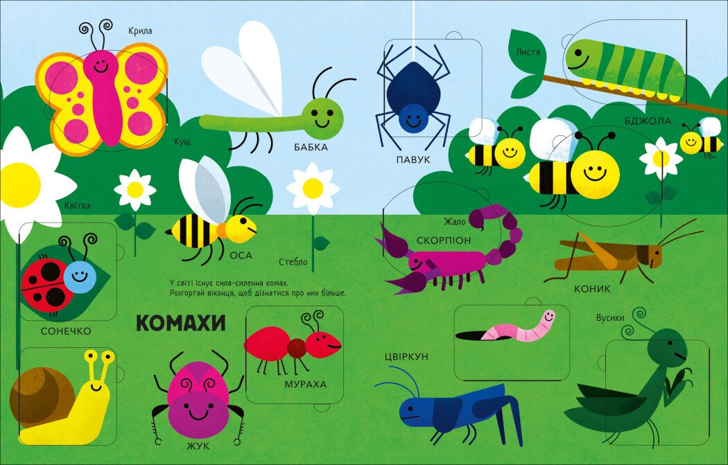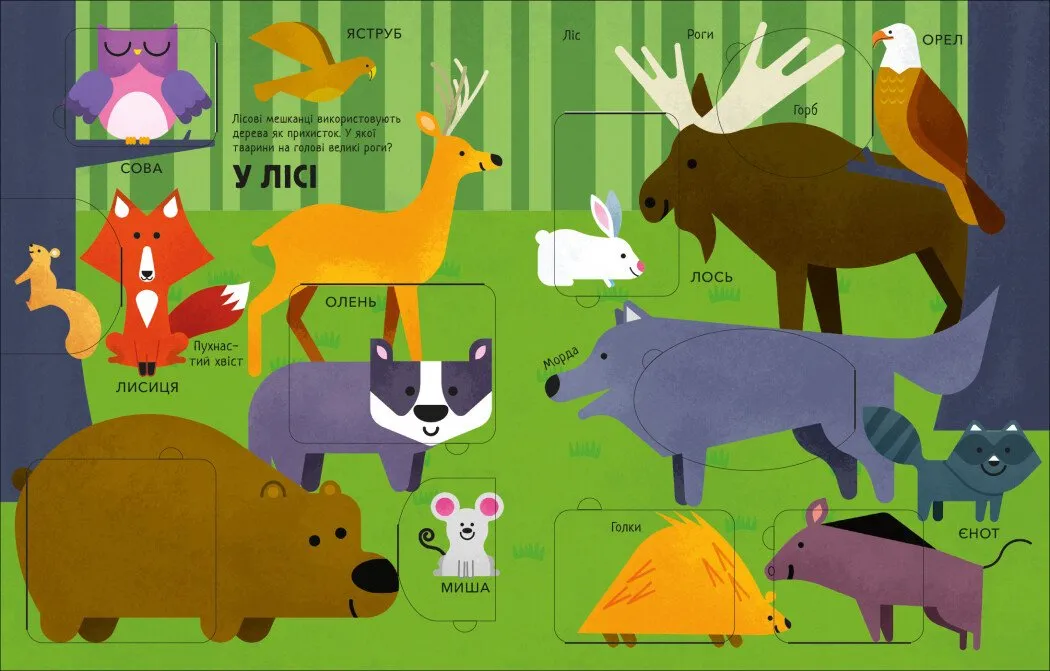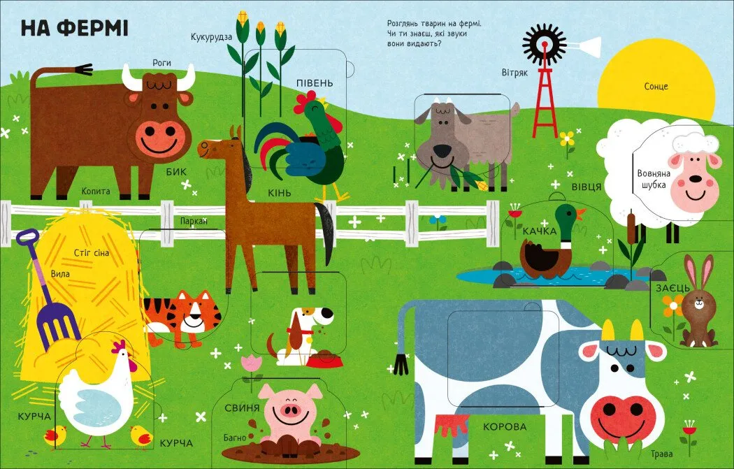 Ця книжка стане незамінною у процесі раннього навчання. Вона охоплює основи пізнання світу тварин і довкілля. Простий і зрозумілий візуальний ряд не перевантажує увагу малюка. А інтерактивні елементи у вигляді віконечок заохочують до активного вивчення.