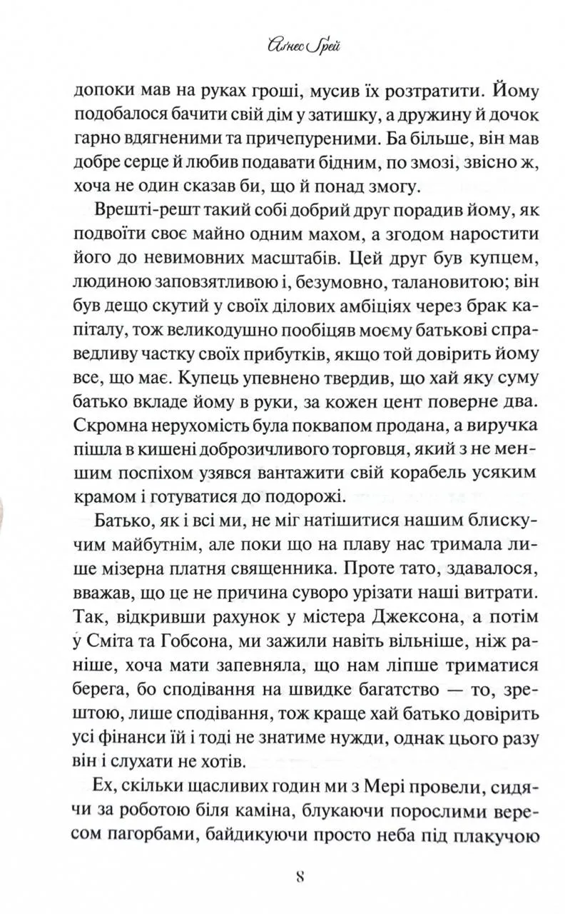 Аґнес Ґрей – це глибока психологічна повість, що входить до серії художньої літератури Квіткова класика. Авторка твору – Бронте Анна, молодша сестра знаменитих Шарлотти та Емілії Бронте, однієї з найяскравіших представниць британської літератури XIX століття. Книга є автобіографічною за духом і побудована на власному життєвому досвіді письменниці, яка свого часу також працювала гувернанткою.