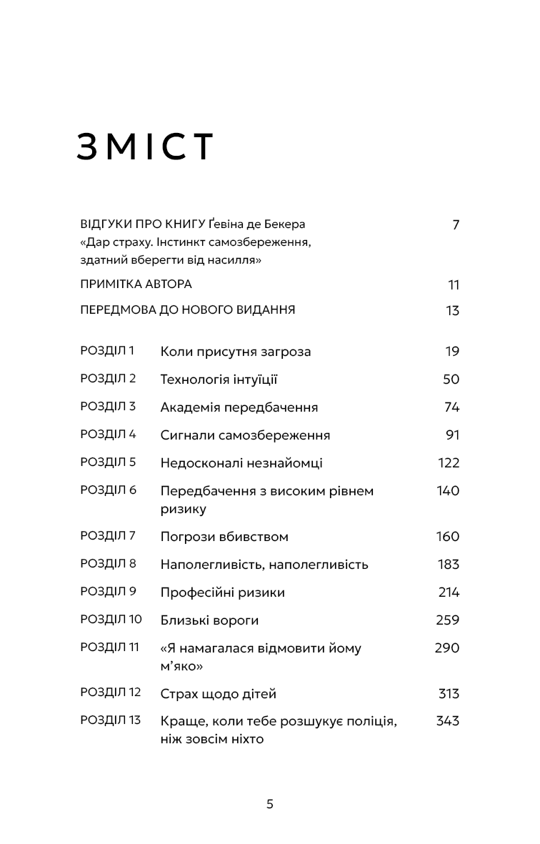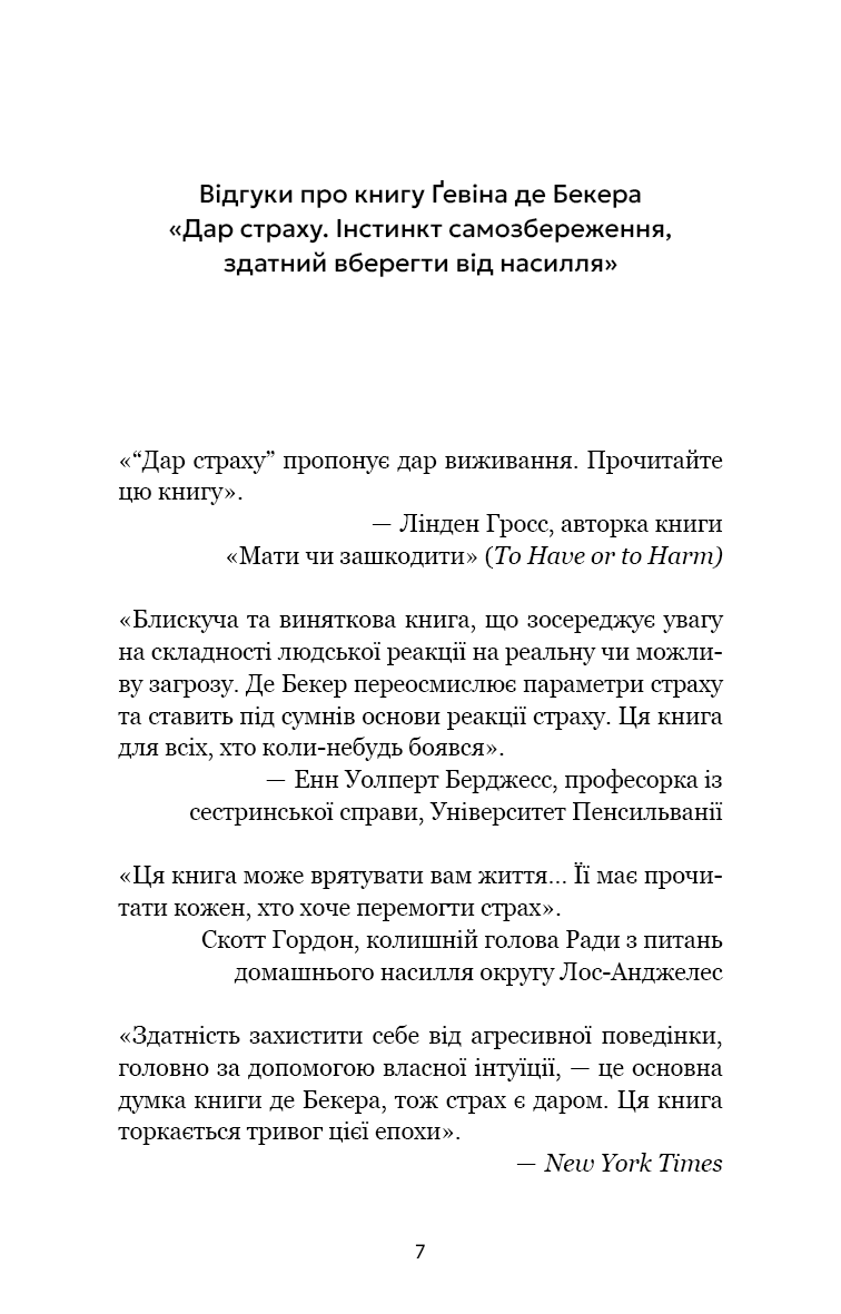 Виживання тварин і наших предків — мавп ґрунтувалося не на аналізі й обмірковуванні можливих загроз, а на інтуїтивному зчитуванні геть незначних для розуму сигналів і миттєвій інстинктивній реакції. З розвитком мозку, раціонального мислення, аналітичних здібностей і технологій людина поступово втрачала здатність чути свою інтуїцію й діяти так, як підказують досвід поколінь і тваринна реакція. У книзі «Дар страху» автор пропонує повернутися до інстинктів, покликаних уберегти наше життя, й спирається на свою багаторічну роботу охоронця, а згодом — власника фірми, що займається охороною особливо важливих осіб: політиків, бізнесменів, видатних людей. Найголовніший ключ до самозахисту — довіряти власній інтуїції. Книга «Дар страху» розповідає, як цьому навчитися.