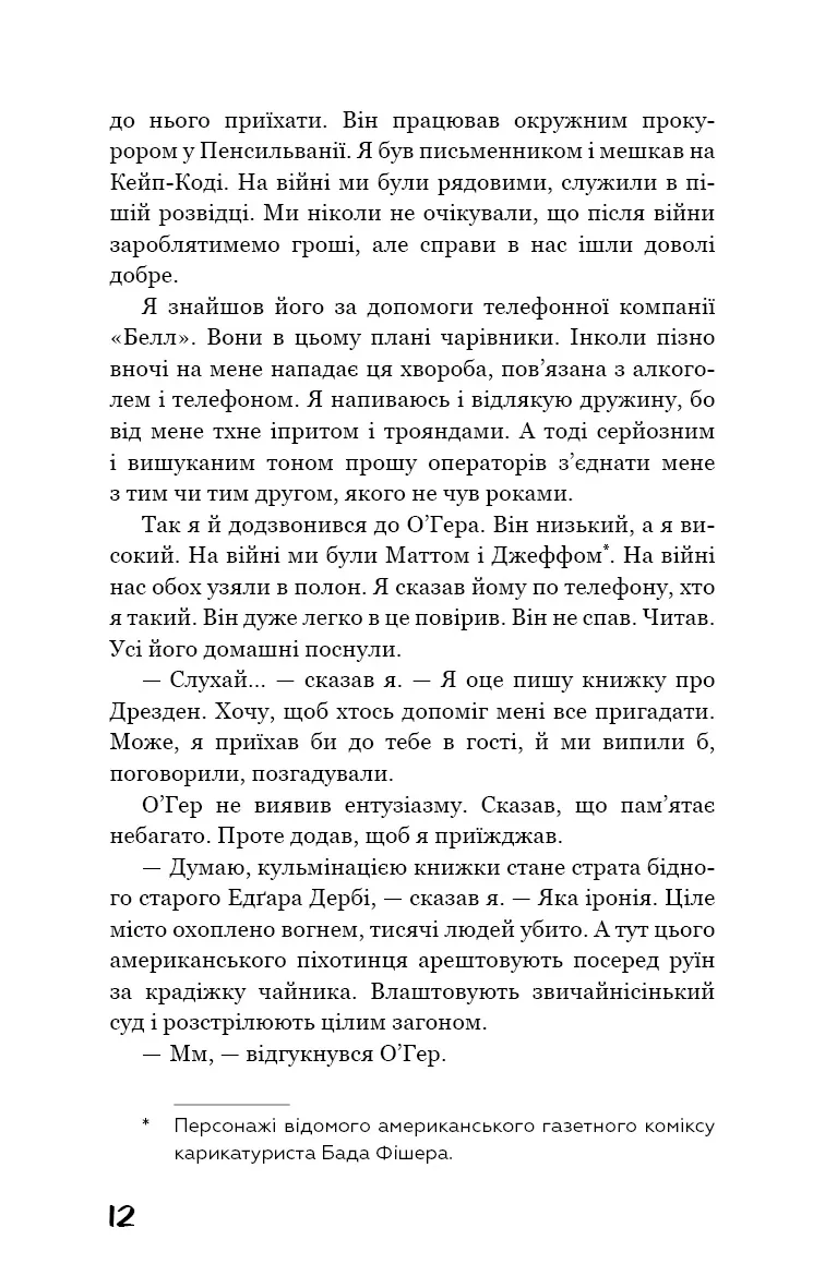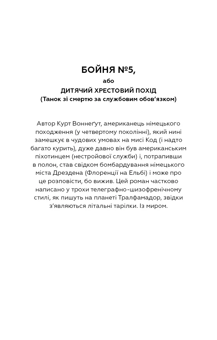 Курт Воннеґут (1922–2007) — американський письменник-фантаст. Є одним із найвагоміших американських письменників XX століття. У творчості майстерно поєднує елементи сатири, чорного гумору й наукової фантастики. Книга «Бойня №5, або Дитячий хрестовий похід» належить до переліку 100 найліпших романів усіх часів, це одна з найзначиміших у світі антивоєнних книг. Події твору розгортаються на тлі сумнозвісного бомбардування Дрездена під час Другої світової війни. Одіссея головного героя — Біллі Пілґрима — крізь час відображає безумну міфічну подорож нашого зруйнованого життя, коли ми намагаємося відшукати сенс у тому, чого боїмося найбільше. Чи зможе автор навчити нас ігнорувати жахливі часи й зосереджуватися на гарних?