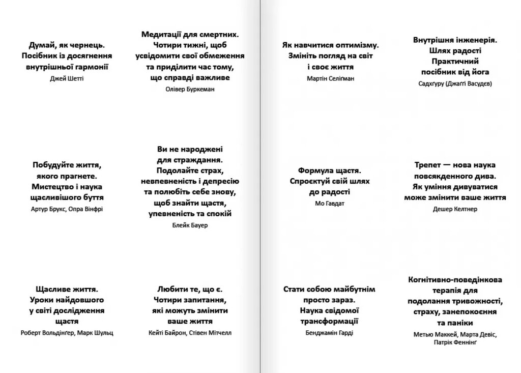 Збірник самарі та аудіокнига Тренажер оптимізму — це унікальний посібник, створений на основі світових бестселерів про щастя, гармонію і психологічне здоров'я. Видання об’єднує знання та поради провідних експертів у галузі саморозвитку та позитивного мислення.