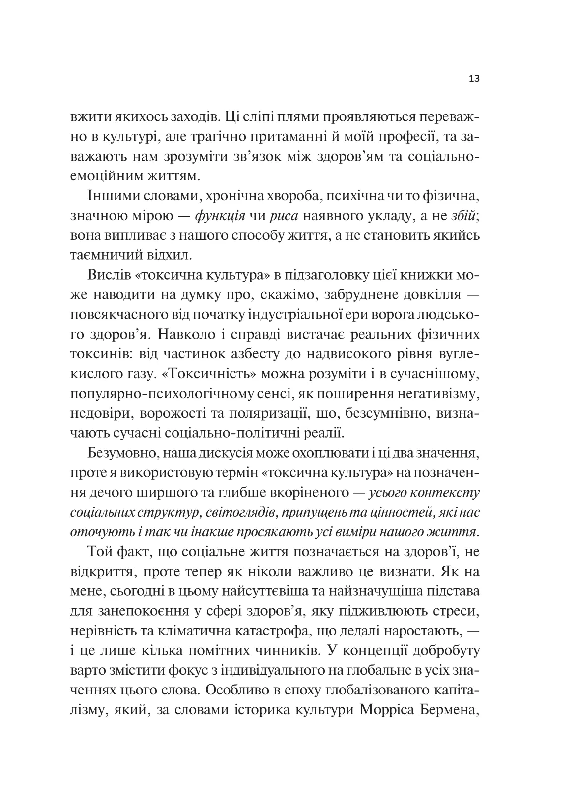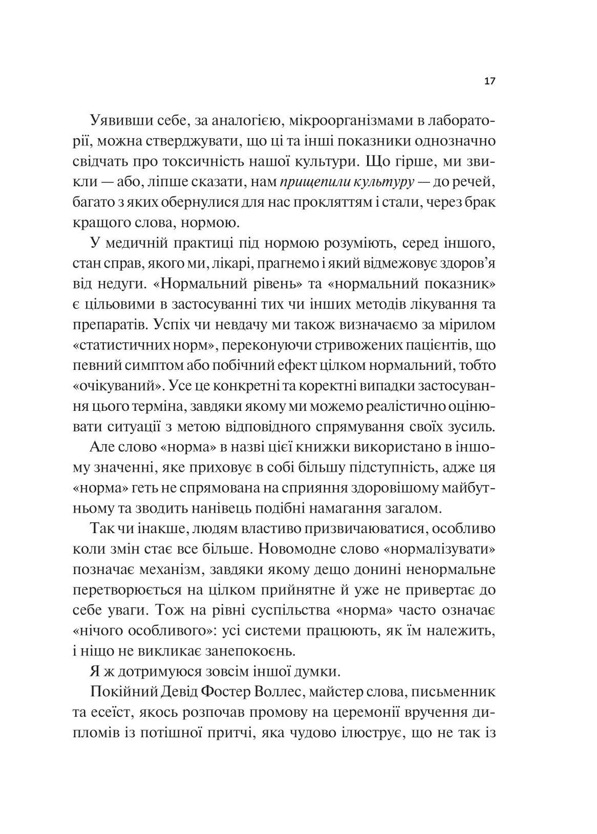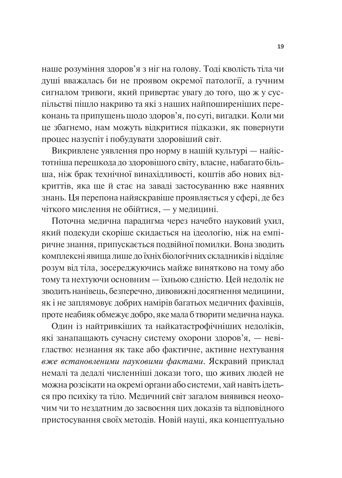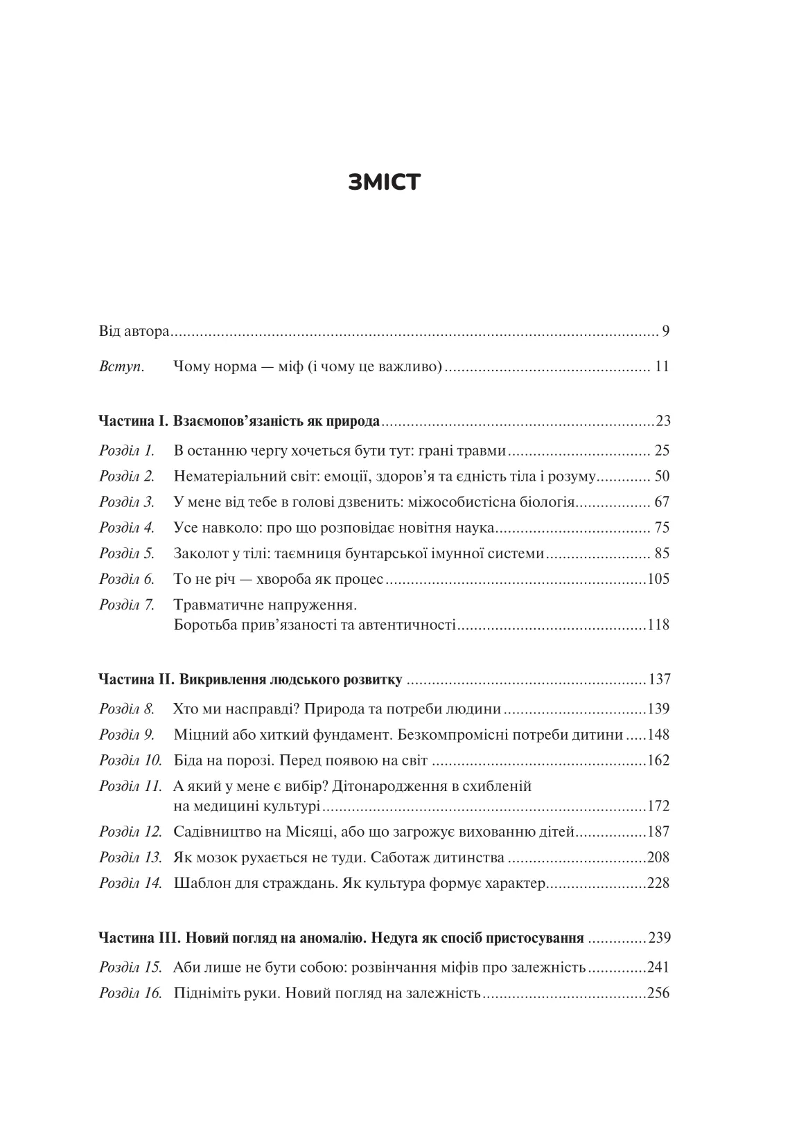 За понад тридцять років лікарської практики Ґабор Мате дійшов висновку, що панівне розуміння норми хибне. У сучасному світі розвиненої медицини кількість випадків хронічних захворювань, психічних розладів і залежностей… невпинно зростає. На наші психіку й здоров’я впливають травми, стрес і стиль життя. Послуговуючись лише досвідом і технічними надбаннями, неможливо вилікувати людину повністю, бо такий підхід ігнорує токсичний вплив сучасної культури. Ґабор Мате в співавторстві із сином Деніелом пропонує власний погляд на поширені навколомедичні міфи, демонструє зв’язок між хворобами окремих людей і погіршенням здоров’я суспільства в цілому. Ця книжка допоможе розібратися: