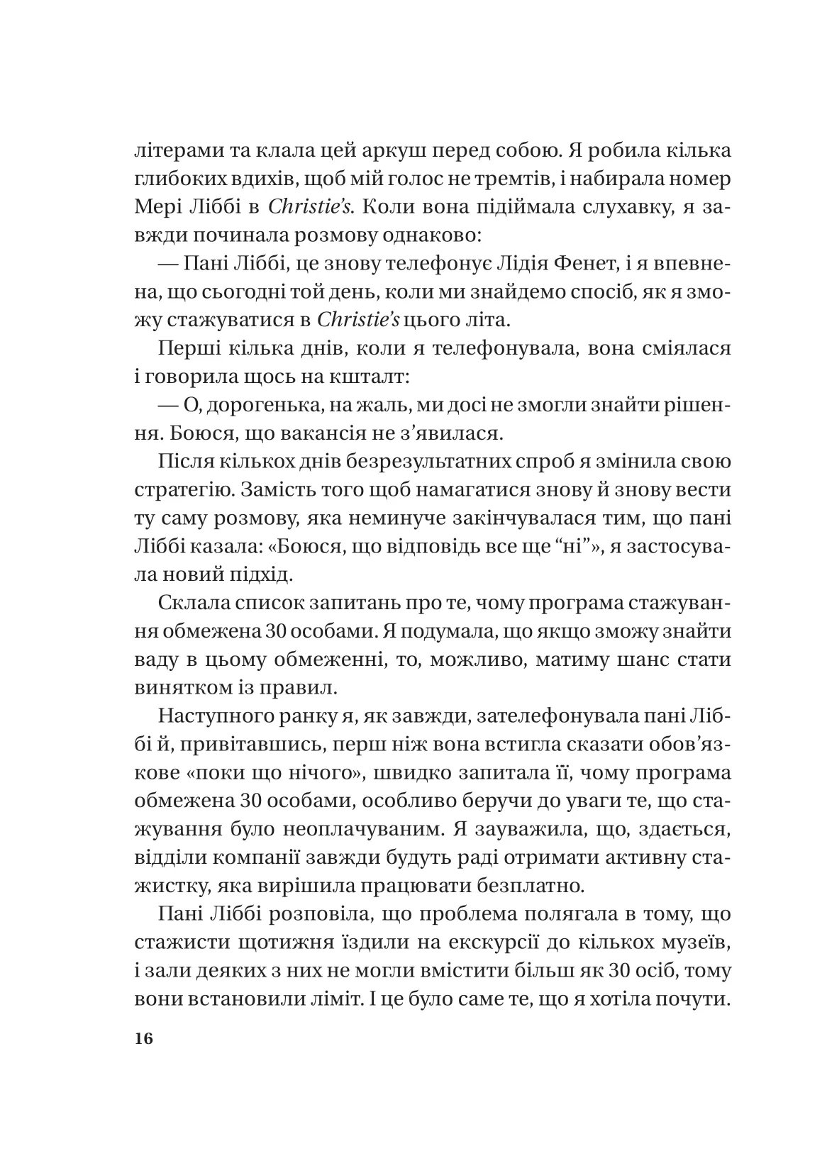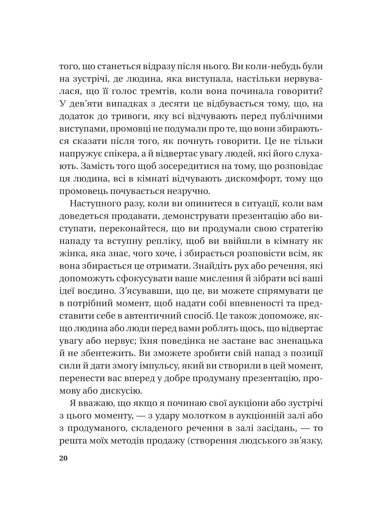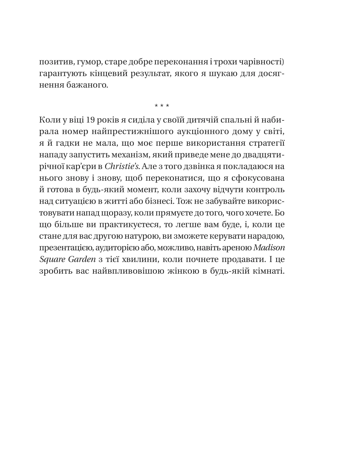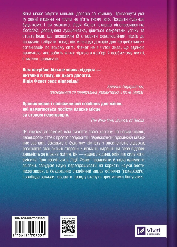 Ця книжка допоможе вам вивести свою кар’єру на новий рівень, перебороти страх просто попросити, перескочити проміжжя мізерних зарплат. Заходьте в будь-яку кімнату з впевненістю лідерки, розкрийте свої сильні сторони й візьміть нарешті на себе відповідальність за власне життя. Ви — єдина людина, якій під силу його змінити. Тож навчіться продавати й налагоджувати зв’язки в Лідії Фенет, забудьте науку перепрошувати на користь науки вести переговори, а бездоганно спокійний вираз обличчя (покерфейс) і свобода завжди говорити правду стануть приємними бонусами.