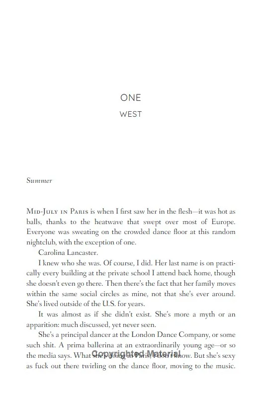 Weston Fontaine is the hottest senior at Lancaster Prep.He could have any girl on campus, except for one.Me.I'm a Lancaster, meaning I'm basically untouchable-or so I thought. My family own the school, which I have to endure before I can return to what I love most: ballet.West doesn't make my time here easy. He's arrogant. Crude. Insufferable. Yet he's the only boy I've ever let touch me...You see, West and I? We share a secret. In Paris, I revealed parts of myself to him I've never shown anyone else. And he did the same.
