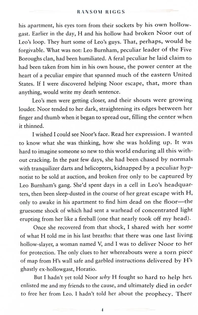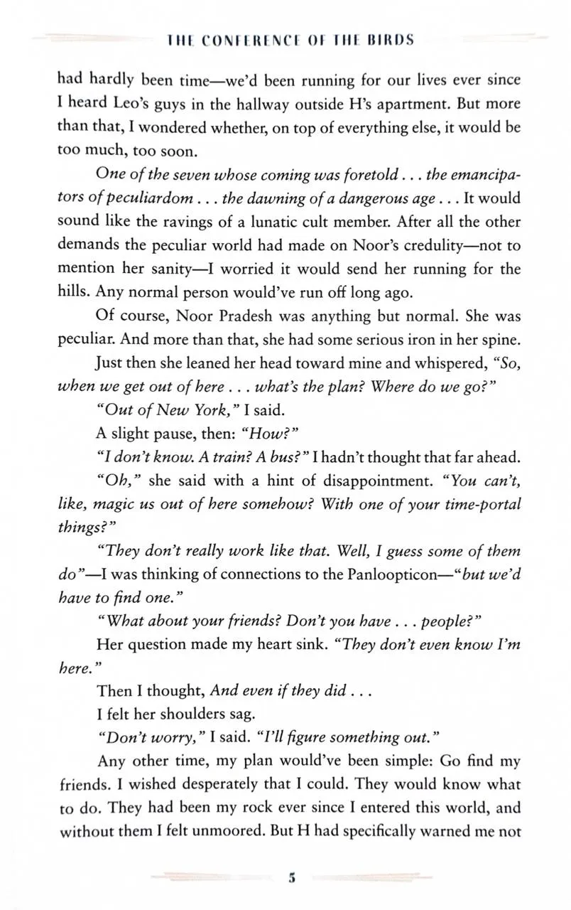 A fragile peace.An apocryphal warning.Chaos waiting in the heart of the storm.With his dying words, H - Jacob's final connection to his grandfather Abe's secret life - entrusts Jacob with a mission: Deliver newly contacted peculiar Noor Pradesh to an operative known only as V.Noor is being hunted. She is the subject of an ancient prophecy, one that foretells a looming apocalypse. Save Noor, save the future of all peculiardom. But with only a few bewildering clues to follow, time is running out.With enemies behind him and the unknown ahead, Jacob Portman's story continues as he takes a brave leap forward into The Conference of the Birds, the newest installment of the beloved, #1 bestselling Miss Peregrine's Peculiar Children series.