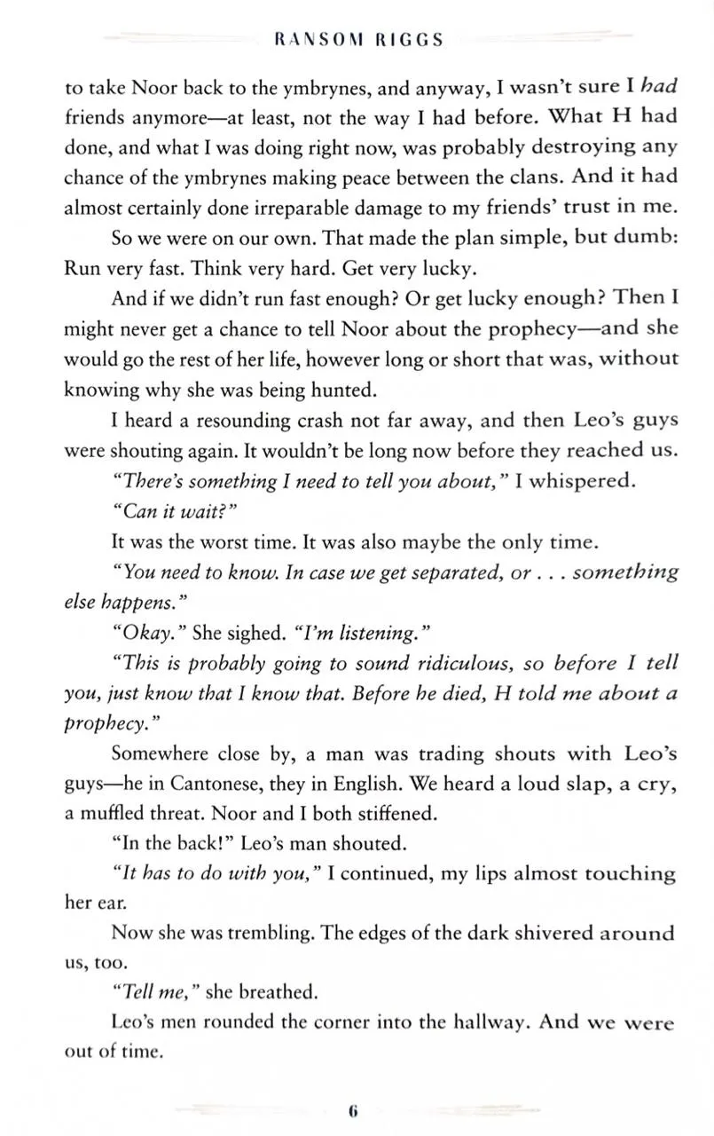 На Нур полюють. Вона — об’єкт давнього пророцтва, яке передбачає близький апокаліпсис. Врятувати Нур — означає врятувати майбутнє всього світу особливих. Але маючи лише кілька заплутаних підказок, Джейкоб відчуває, що час стрімко спливає.
