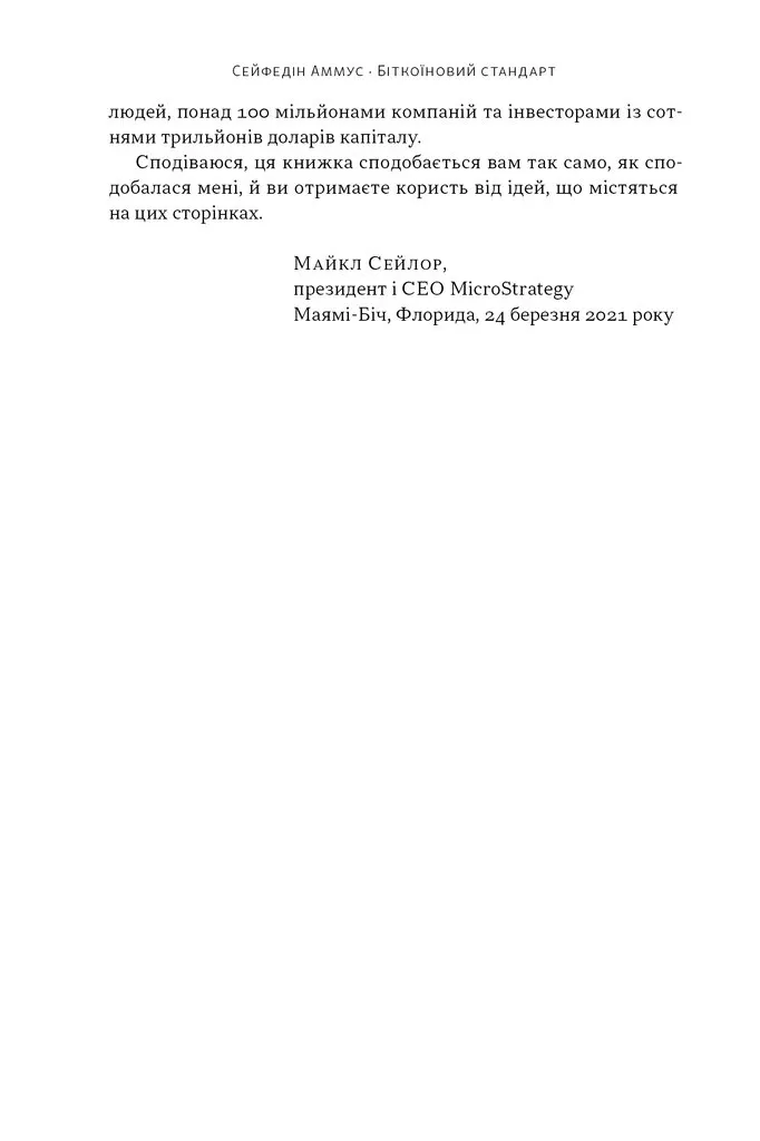 Біткоїн має обмежену пропозицію, що робить його захистом проти інфляційних ризиків, характерних для фіатних валют. Його децентралізована структура зменшує можливості урядів і центральних банків впливати на розподіл монетарних ресурсів. Саме цьому присвячена основна частина книги, яка дає розуміння того, чому біткоїн не просто цифрова валюта, а фундамент для нової фінансової парадигми.