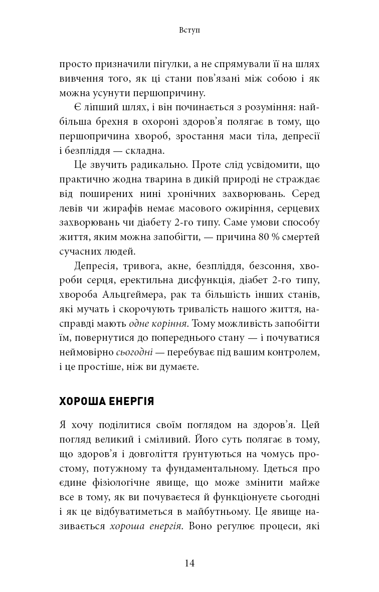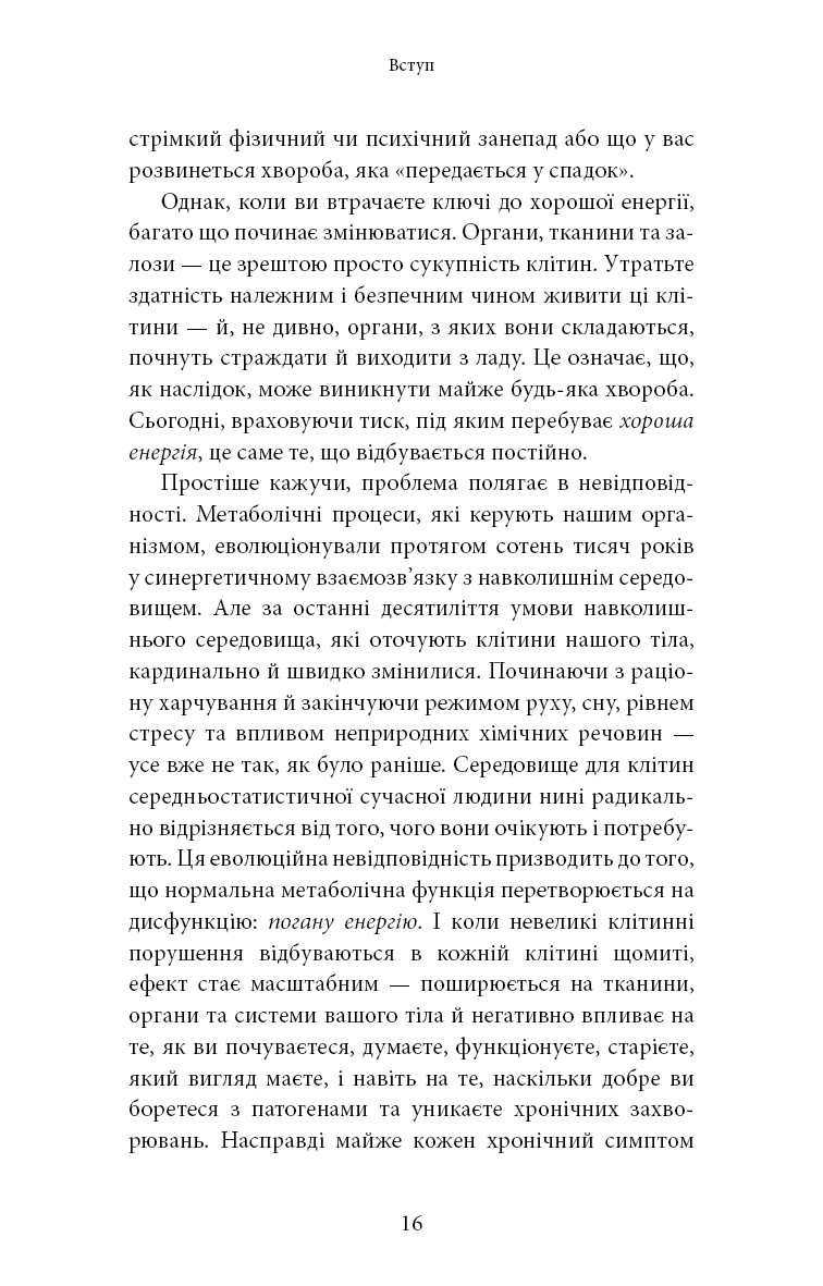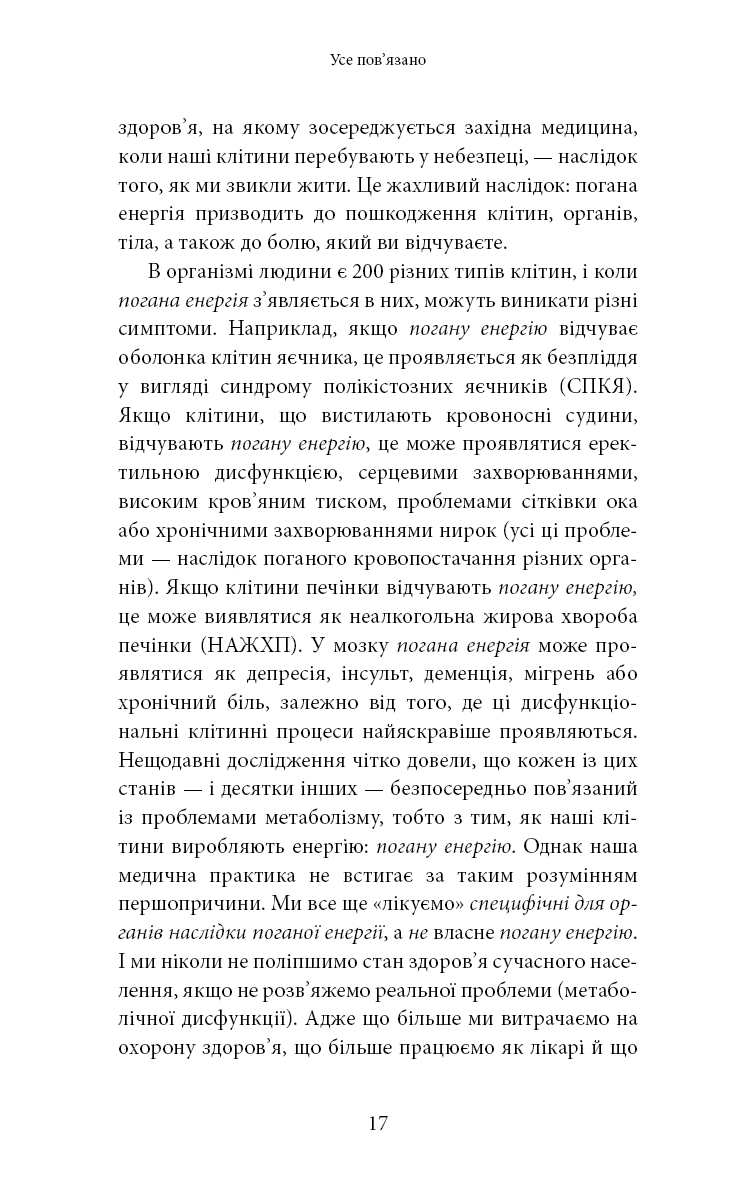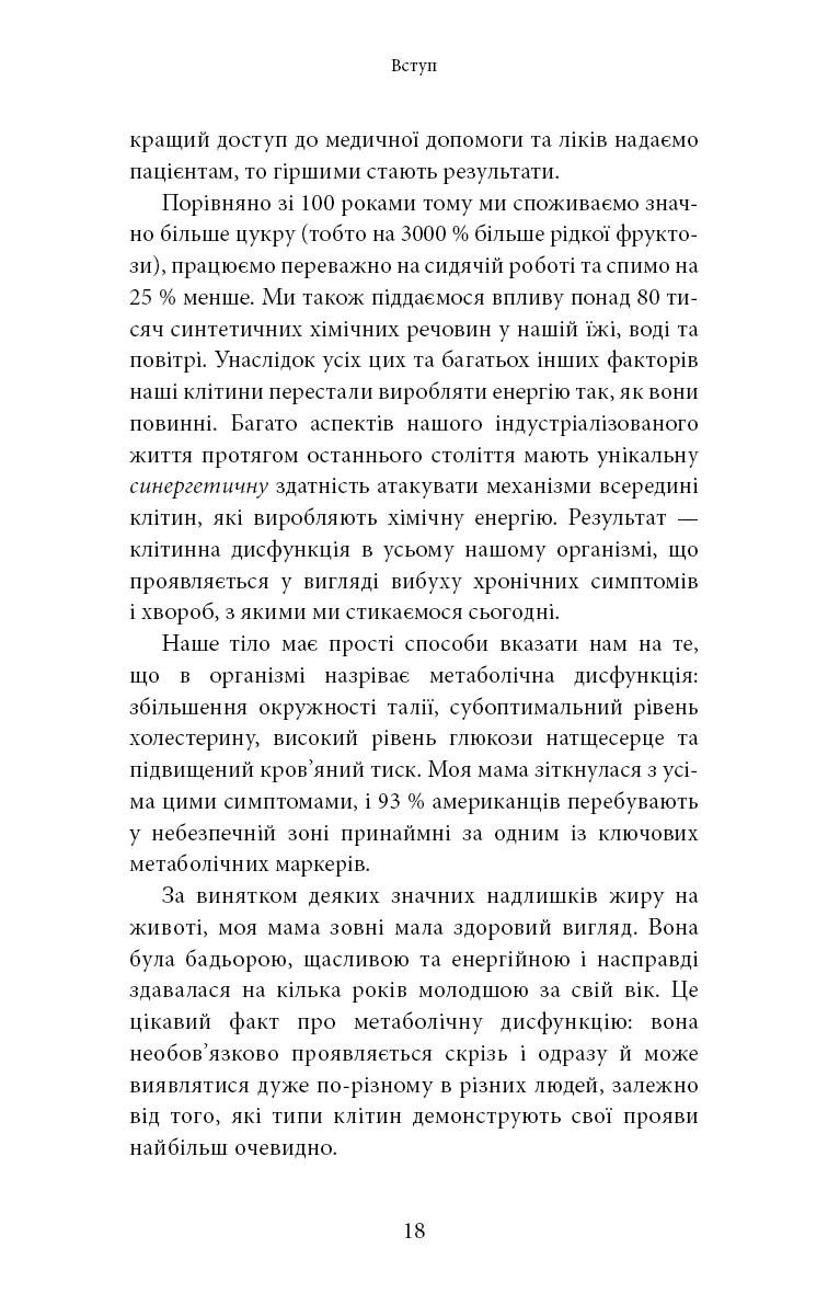 Виявляється, депресія, тривога, безпліддя, безсоння, хвороби серця, еректильна дисфункція, діабет 2-го типу, хвороба Альцгеймера, деменція та багато інших захворювань, які нас виснажують, насправді мають одну й ту саму першопричину. Також виявляється, що ми маємо здатність знайти її і усунути, а відтак запобігти багатьом недугам або позбутися їх. Ключовим, однак найменш дослідженим фактором нашого здоров‘я є метаболізм. Майже кожну проблему зі здоров’ям можна пояснити тим, наскільки добре клітини нашого тіла створюють і використовують енергію. Щоб жити без неприємних симптомів і хвороб, які загрожують життю, нам потрібно, щоб наші клітини отримували оптимальне живлення й могли створювати «хорошу енергію» — важливе паливо, яке впливає на всі аспекти нашого фізичного та психічного благополуччя. Поєднуючи найсучасніші дослідження й особисті історії, авторка пропонує чотиритижневий план, який допоможе відновити баланс енергії у вашому тілі, а відтак забути про багато недуг.