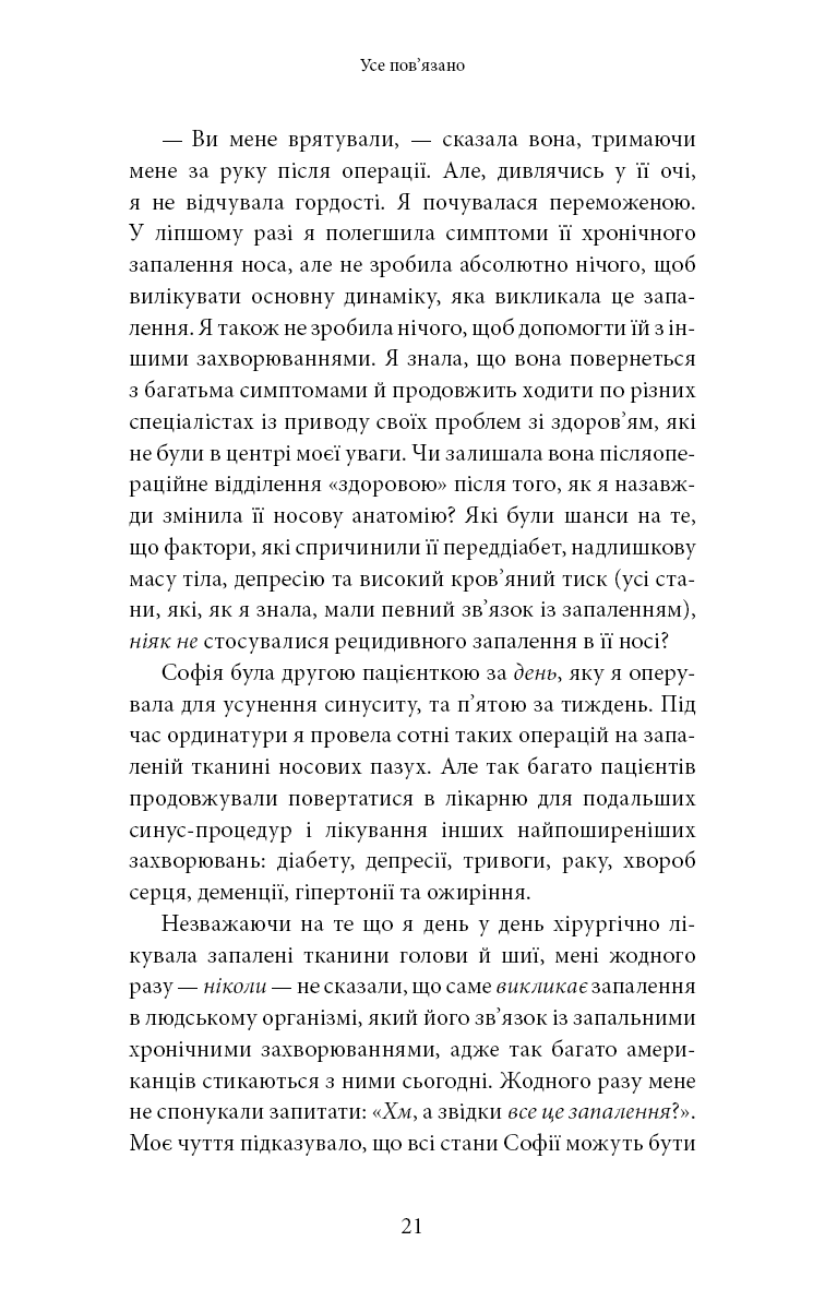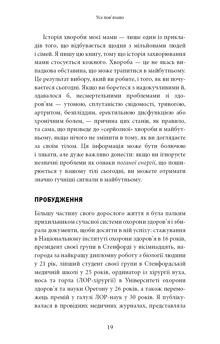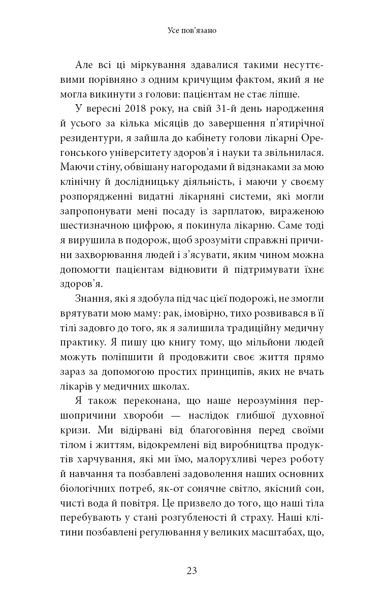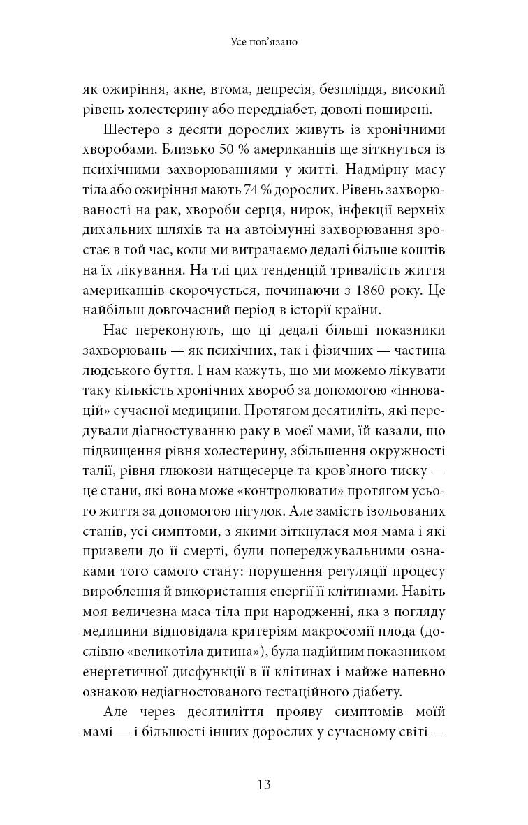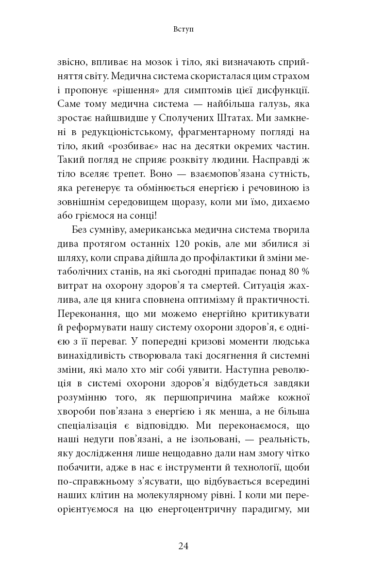 Виявляється, депресія, тривога, безпліддя, безсоння, хвороби серця, еректильна дисфункція, діабет 2-го типу, хвороба Альцгеймера, деменція та багато інших захворювань, які нас виснажують, насправді мають одну й ту саму першопричину. Також виявляється, що ми маємо здатність знайти її і усунути, а відтак запобігти багатьом недугам або позбутися їх. Ключовим, однак найменш дослідженим фактором нашого здоров‘я є метаболізм. Майже кожну проблему зі здоров’ям можна пояснити тим, наскільки добре клітини нашого тіла створюють і використовують енергію. Щоб жити без неприємних симптомів і хвороб, які загрожують життю, нам потрібно, щоб наші клітини отримували оптимальне живлення й могли створювати «хорошу енергію» — важливе паливо, яке впливає на всі аспекти нашого фізичного та психічного благополуччя. Поєднуючи найсучасніші дослідження й особисті історії, авторка пропонує чотиритижневий план, який допоможе відновити баланс енергії у вашому тілі, а відтак забути про багато недуг.
