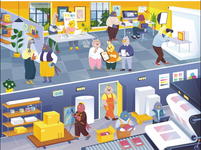 Цей картонний віммельбух не лише яскраво ілюстрований, а й наповнений практичною інформацією. У книзі змальовано безліч робочих середовищ, де діти бачать:
