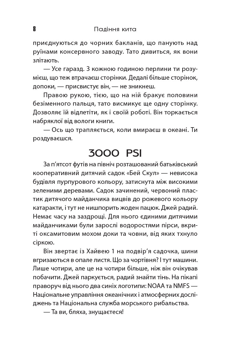 Книга має всі шанси залишитися в літературній памʼяті на роки. Падіння кита — це не просто пригодницький роман, це подорож у серце людини, яка зіткнулася зі складною втратою і перемагає, опинившись один на один з природою.