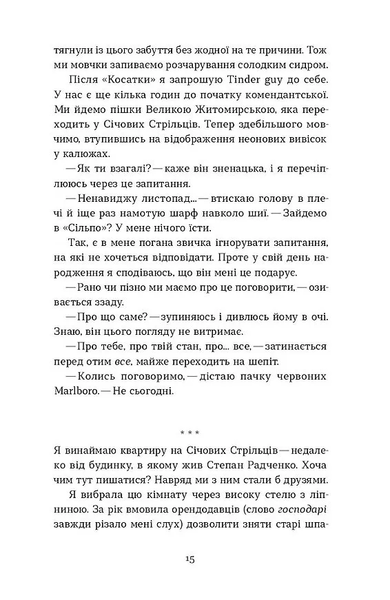 Роман переносить нас на затишні вулички Києва, у його переповнені бари, старі кінотеатри й неповторну атмосферу. Місто відіграє важливу роль у розкритті емоцій та переживань персонажів, уособлюючи водночас дім і втрату, спокій і зміни.