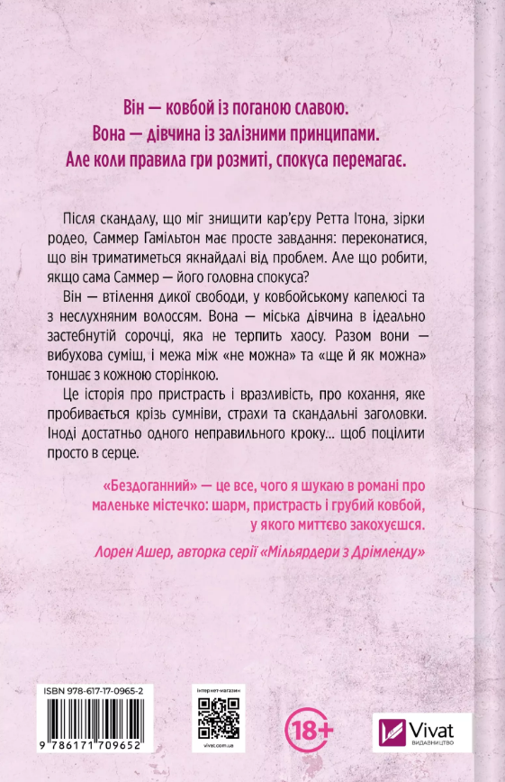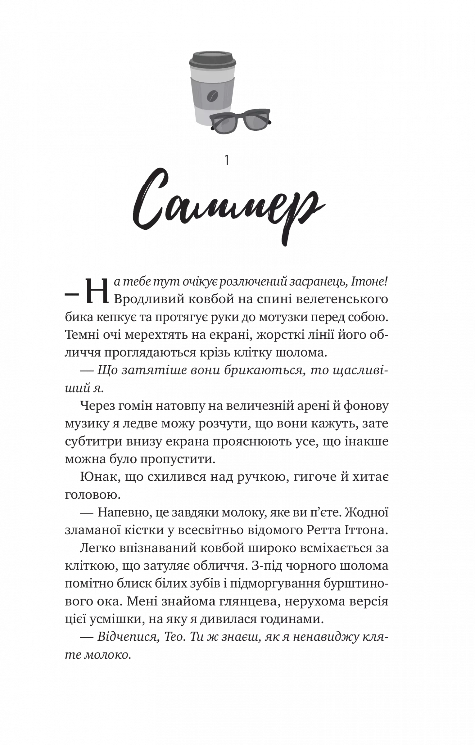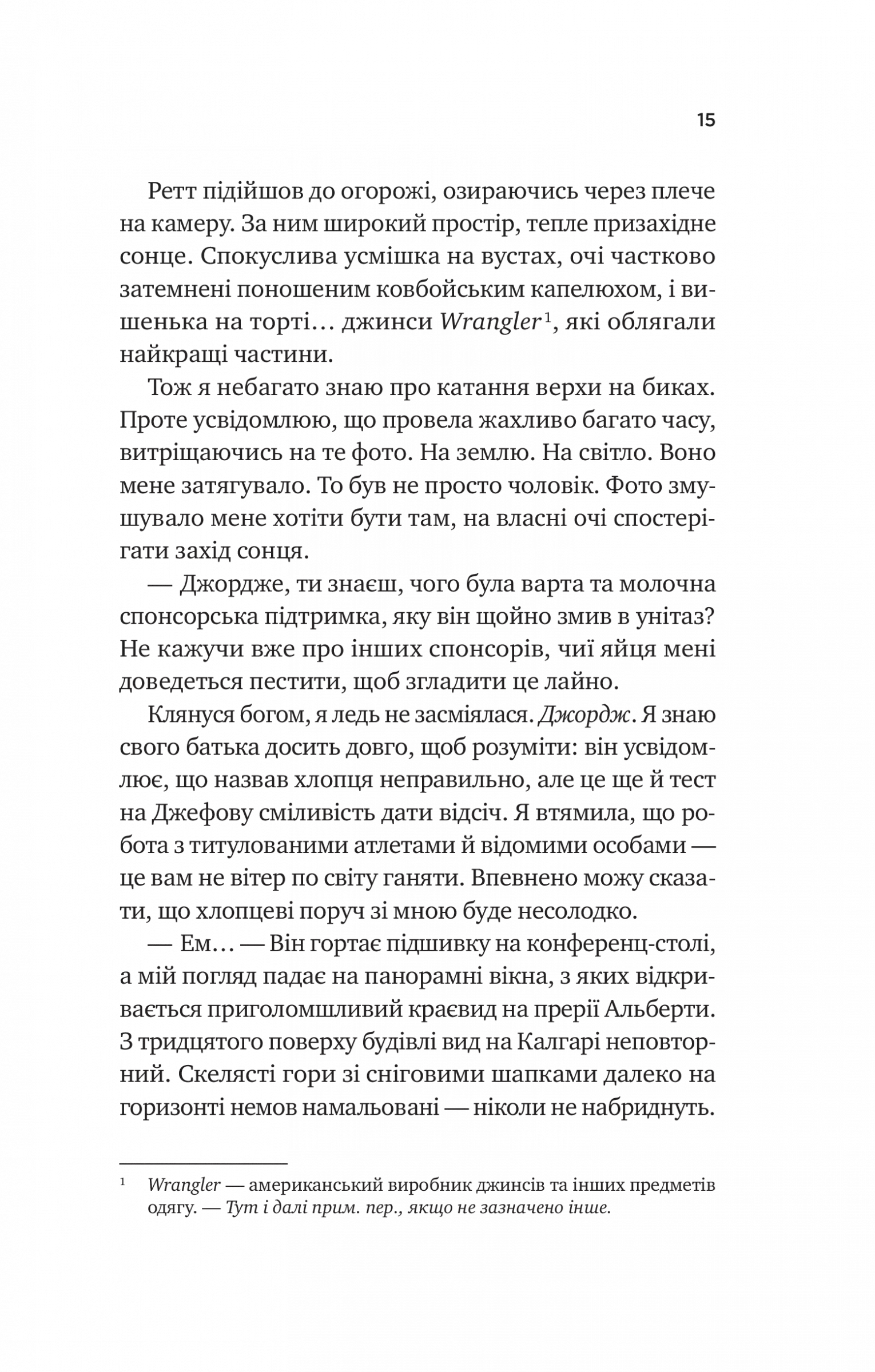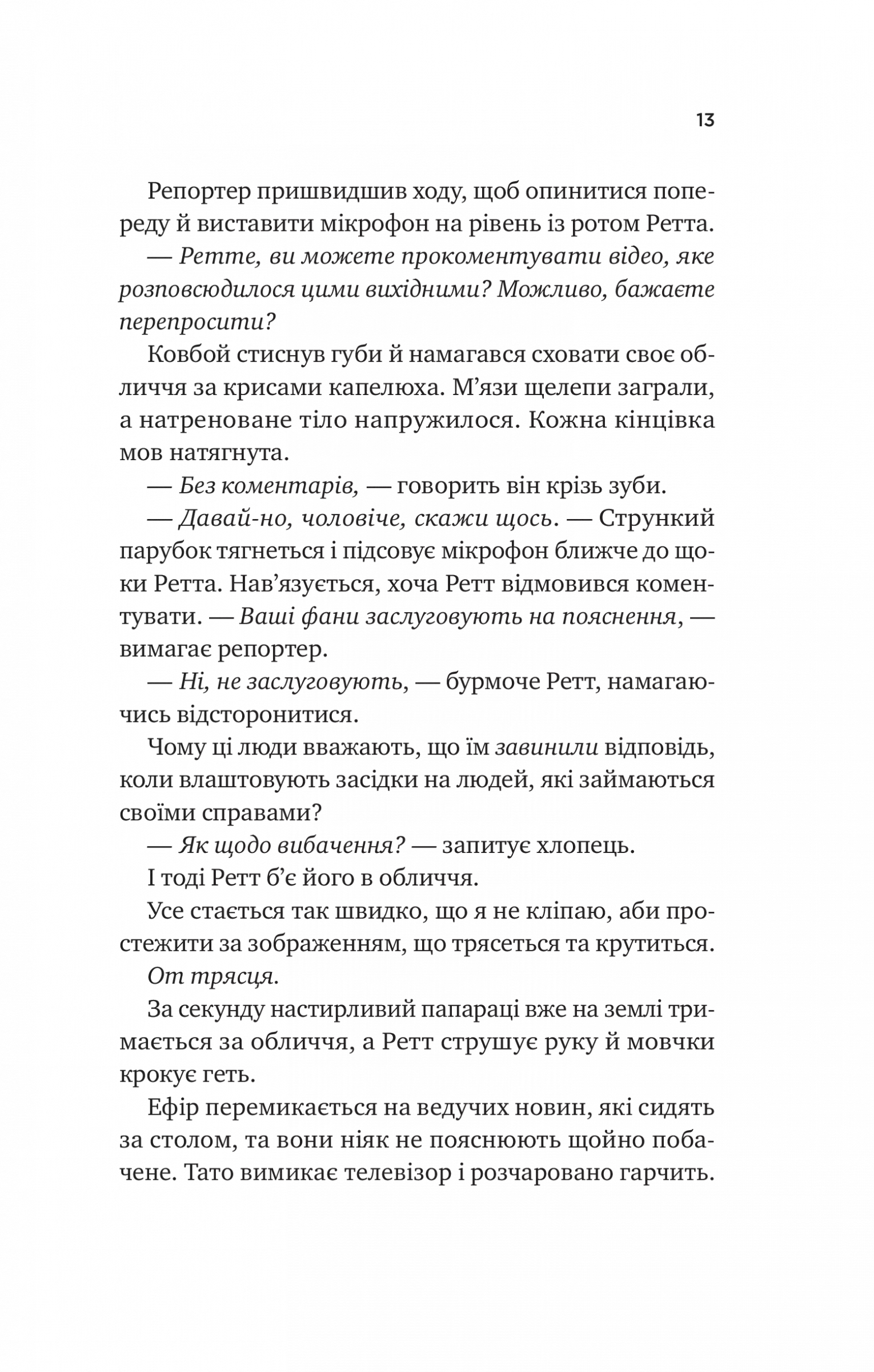 Він — втілення дикої свободи, у ковбойському капелюсі та з неслухняним волоссям. Вона — міська дівчина в ідеально застебнутій сорочці, яка не терпить хаосу. Разом вони — вибухова суміш, і межа між «не можна» та «ще й як можна» тоншає з кожною сторінкою. Це історія про пристрасть і вразливість, про кохання, яке пробивається крізь сумніви, страхи та скандальні заголовки. Іноді достатньо одного неправильного кроку… щоб поцілити просто в серце.