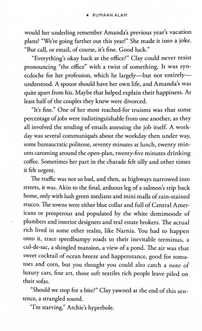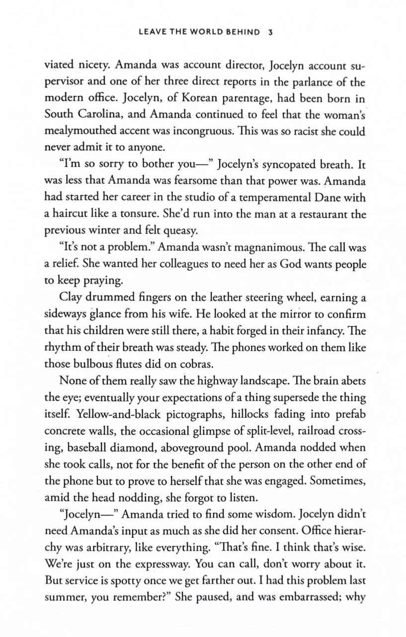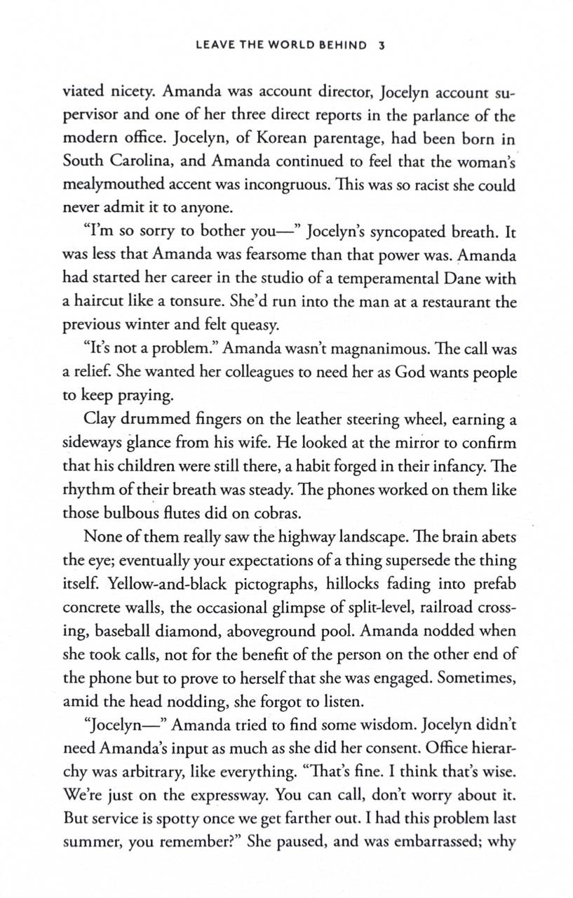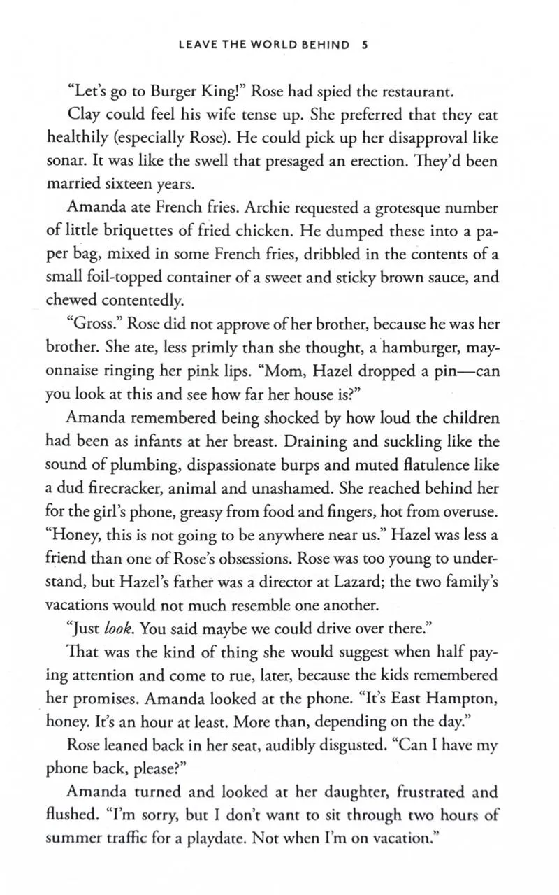 A magnetic novel about two families, strangers to each other, who are forced together on a long weekend gone terribly wrongAmanda and Clay head to a remote corner of Long Island expecting a a quiet reprieve from life in New York City, quality time with their teenage son and daughter and a taste of the good life in the luxurious home they've rented for the week. But with a late-night knock on the door, the spell is broken. Ruth and G. H., an older couple who claim to own the home, have arrived there in a panic. These strangers say that a sudden power outage has swept the city, and - with nowhere else to turn - they have come to the country in search of shelter.But with the TV and internet down, and no phone service, the facts are unknowable. Should Amanda and Clay trust this couple - and vice versa? What has happened back in New York? Is the holiday home, isolated from civilisation, a truly safe place for their families? And are they safe from one another?