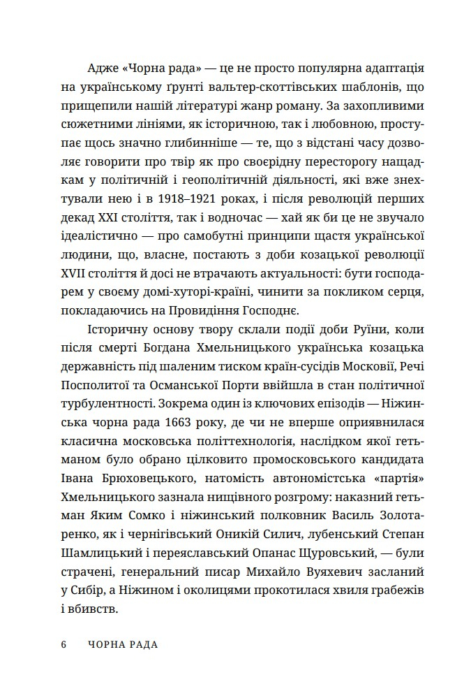 Чорна рада — не просто історичний роман, а твір-пересторога. Він віддзеркалює складні періоди української історії через призму доленосного вибору. Навіть сьогодні критики звертають увагу на паралелі з сучасною українсько-російською війною, вбачаючи в романі глибокий політичний підтекст.