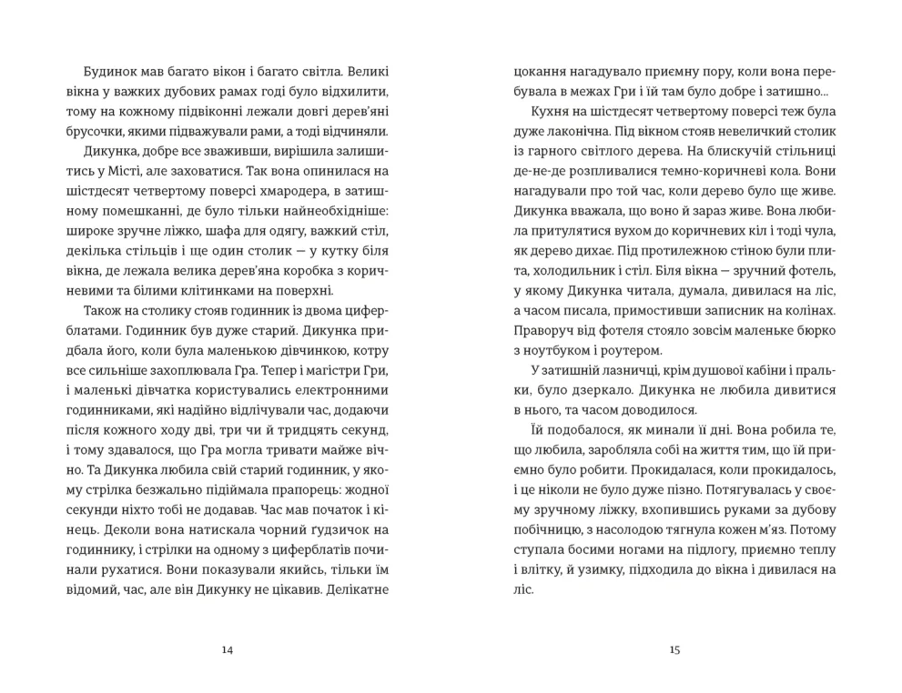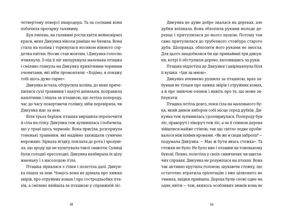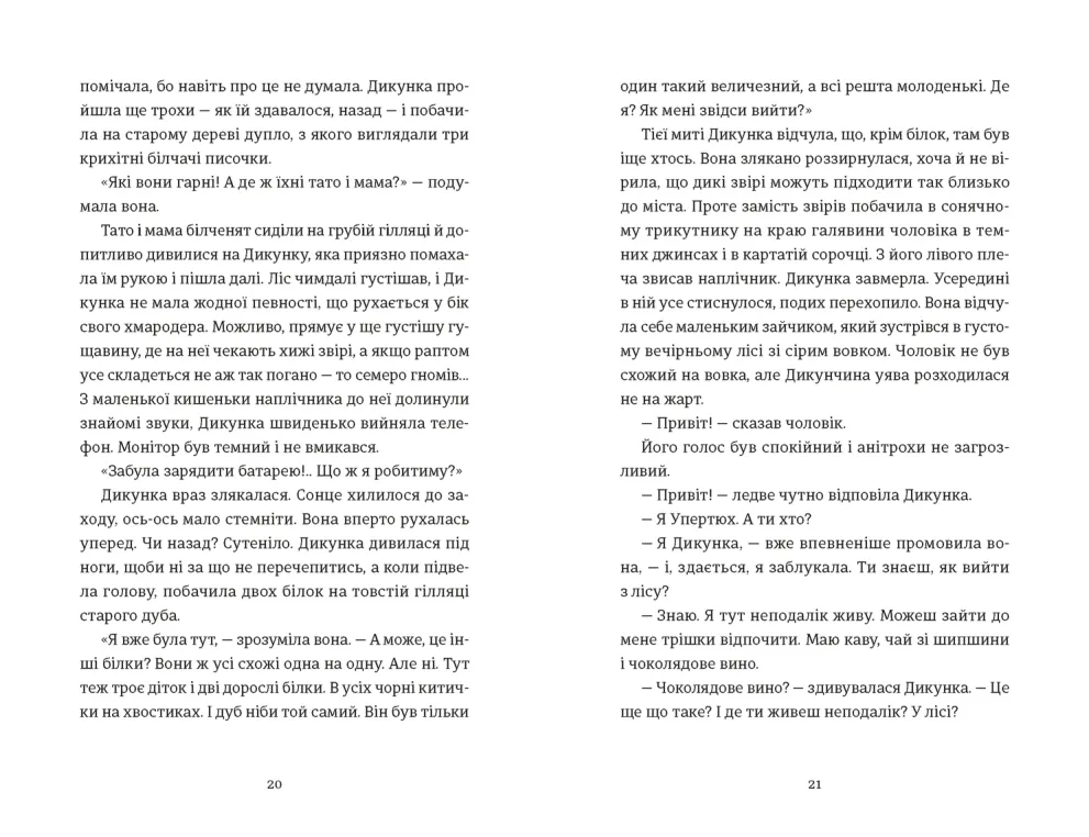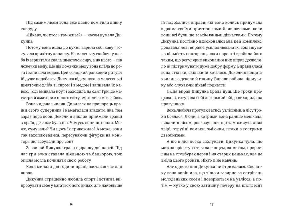 У центрі тексту — розмова двох персонажів, Упертюха і Дикунки, жінки, що постає як своєрідна оповідачка-провідниця у світ спогадів, болю і самоусвідомлення. Ділячись з Упертюхом химерними історіями з родинної саги Маґди і Стефана, через тонкі психологічні нюанси, шахові партії, сни і побутові сцени Дикунка поступово розкриває теми тілесного і душевного болю, пережитої хвороби, смерті, самотності й пошуку ідентичності.