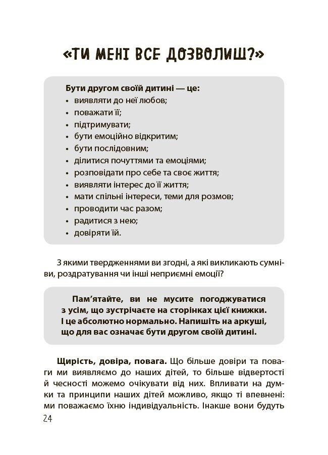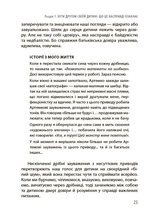 Авторка порушує актуальне питання – чи варто бути найкращим другом для своєї дитини. Вона досліджує глибину батьківських страхів: «Чи не надто я строгий?», «Чи довіряє мені моя дитина?», «Чи дружні ми з нею насправді?» І головне – як знайти правильний баланс між дружніми відносинами та батьківською відповідальністю.