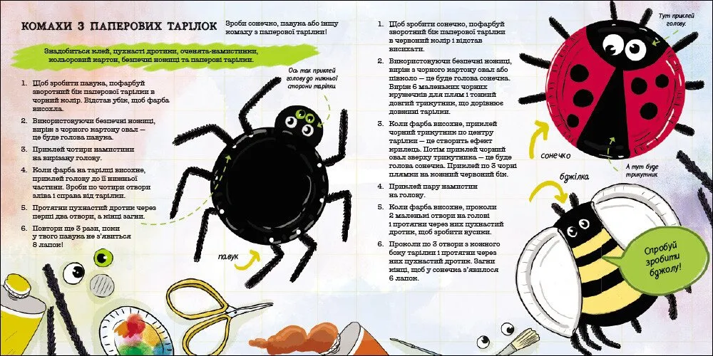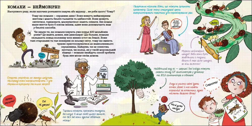 Окрім мурах, у виданні також йдеться про інші види комах, зокрема сонечок, павуків та жуків. Дітям буде цікаво дізнатися, як комахи допомагають одне одному виживати, які механізми захисту вони використовують та як комунікують між собою.
