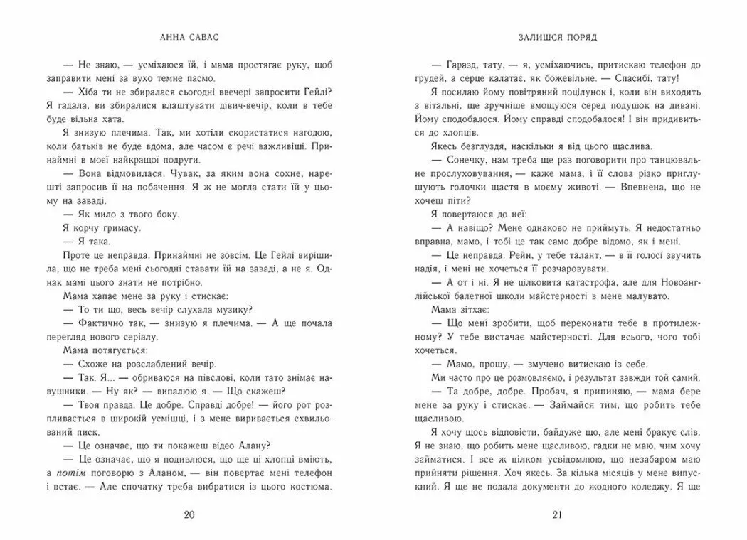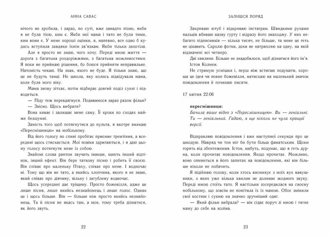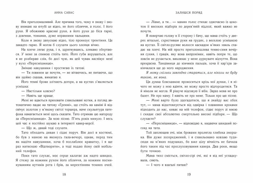Роман Залишся поряд, написаний талановитою Анною Савас, є сучасною історією пошуку себе через музику, танець та силу почуттів. У ній поєднуються драма, кохання та мистецтво — три складники, які тримають читача у напрузі до останньої сторінки.
