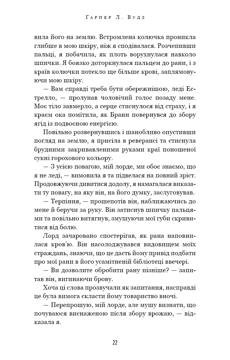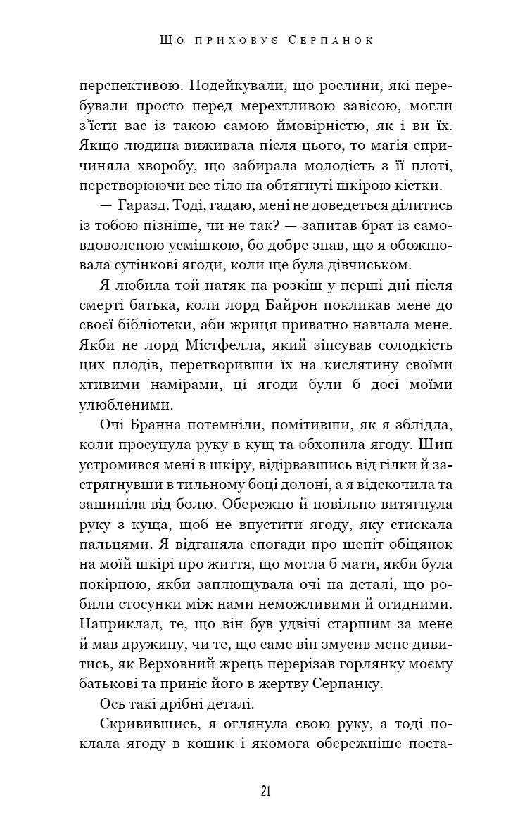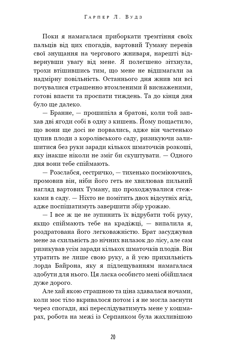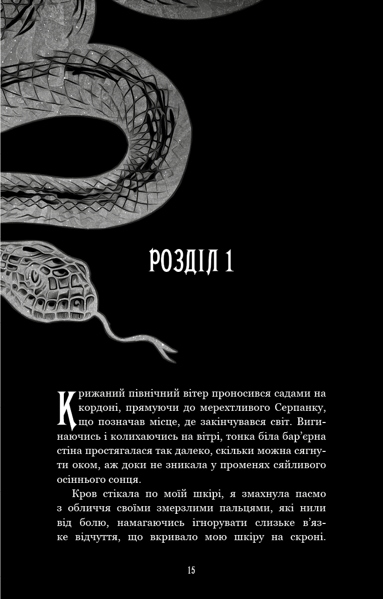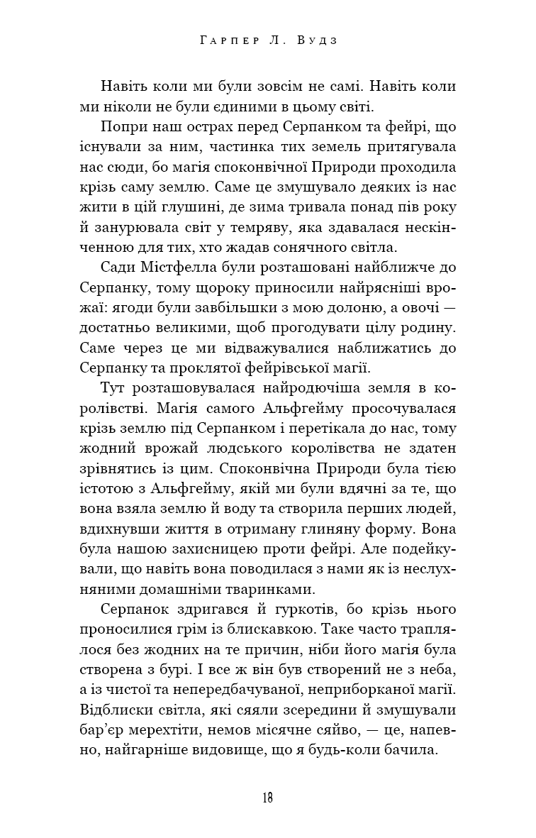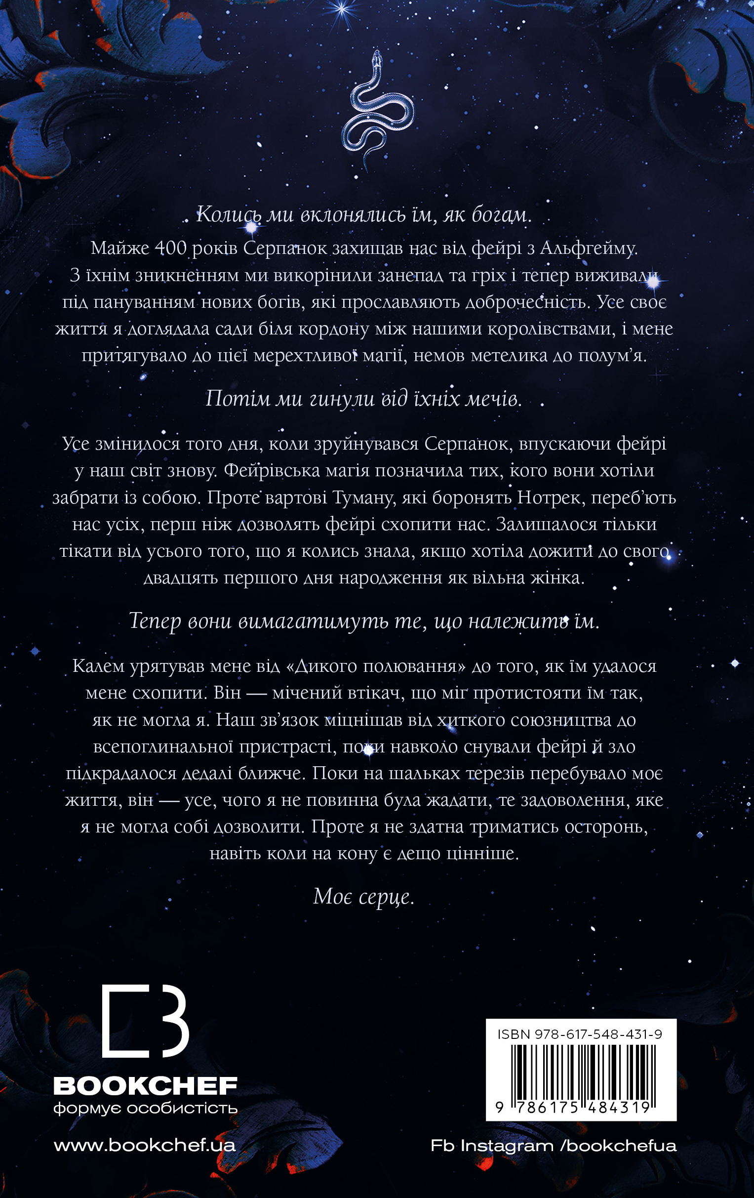 Майже 400 років Серпанок захищав нас від фейрі з Альфгейму. З їхнім зникненням ми викорінили занепад та гріх і тепер виживали під пануванням нових богів, які прославляють доброчесність. Усе своє життя я доглядала сади біля кордону між нашими королівствами, і мене притягувало до цієї мерехтливої магії, немов метелика до полум’я.