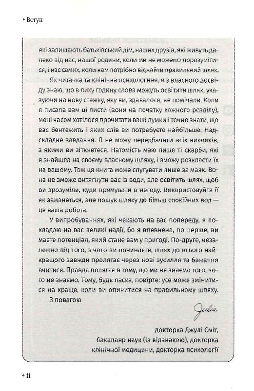 Кожен розділ книги — це окрема життєва ситуація. У стилі щирих звернень Джулі Сміт надає рекомендації та техніки, що допомагають усвідомити свої емоції, взяти паузу й повернути контроль над ситуацією.