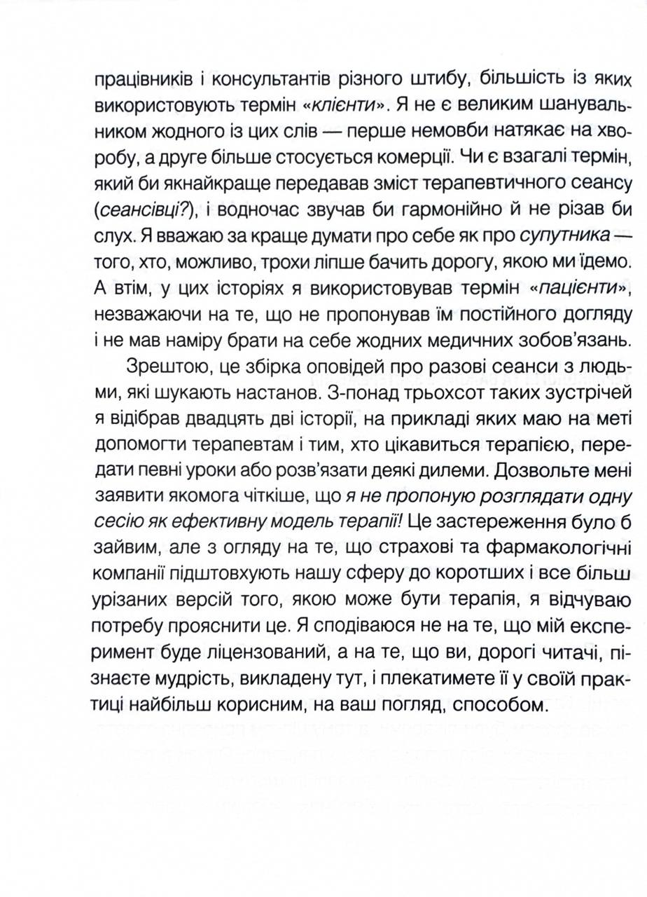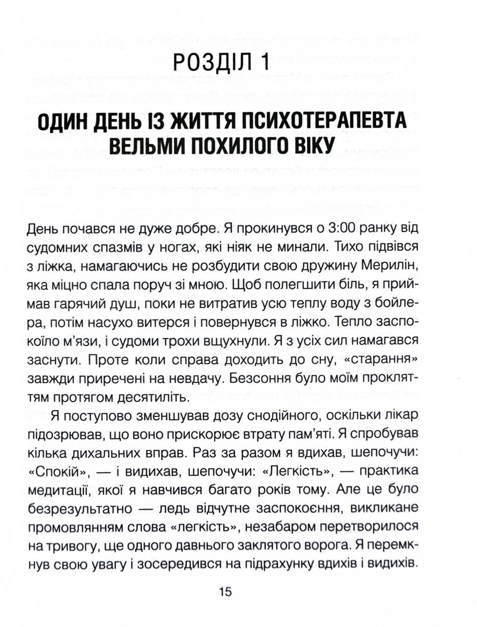 Зіткнувшись з втратою пам'яті у поважному віці — 93 роки — Ялом не покинув свою практику. Навпаки, він обирає сміливий підхід: проводити лише одну годинну сесію з клієнтами, намагаючись домогтися значного прориву за обмежений час. У цьому методі в основі лежить його культовий підхід тут і зараз, який вже довів свою ефективність у попередніх роботах автора.