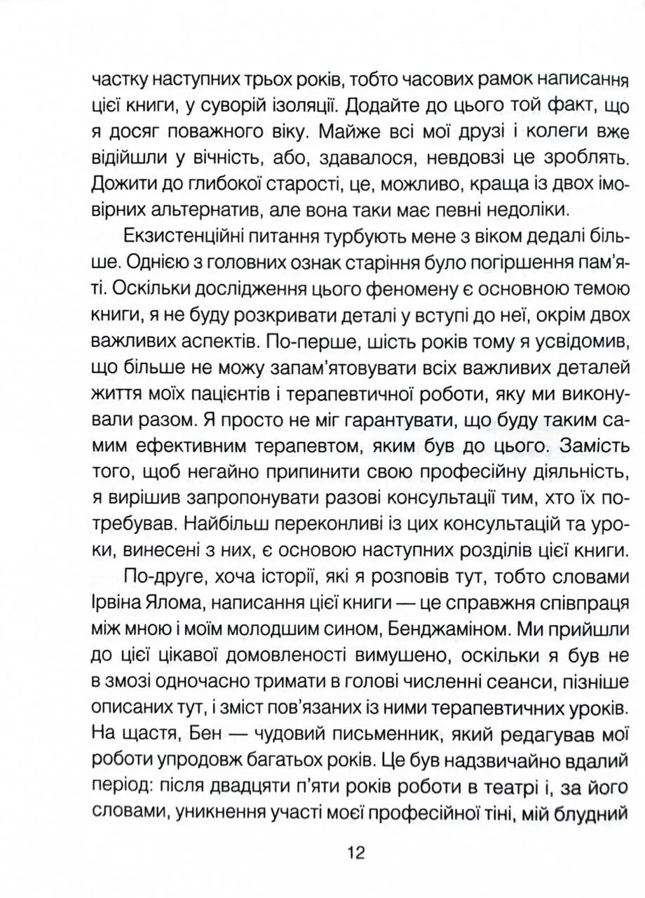Ірвін Ялом — один із провідних психотерапевтів ХХІ століття, автор класичних праць Шопенгауер як ліки, Коли Ніцше плакав та Мамо і сенс життя. Його книги поєднують глибоку психотерапевтичну мудрість із художнім талантом оповідача.