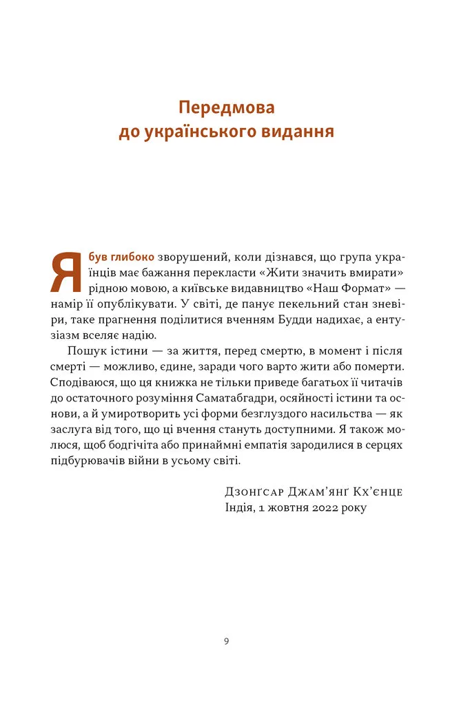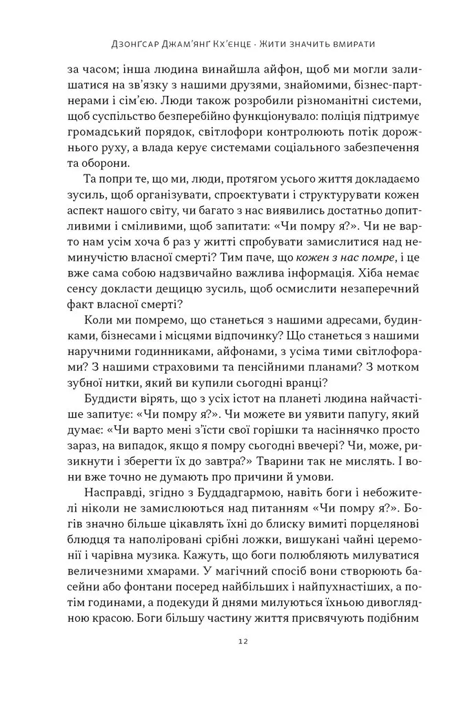 Книжка Жити значить вмирати. Як підготуватись до смерті, вмирання і того, що буде далі авторства Дзонґсара Джам'янґа Кхьєнце — це глибока та водночас доступна розповідь про той неминучий життєвий процес, що лякає багатьох — смерть.