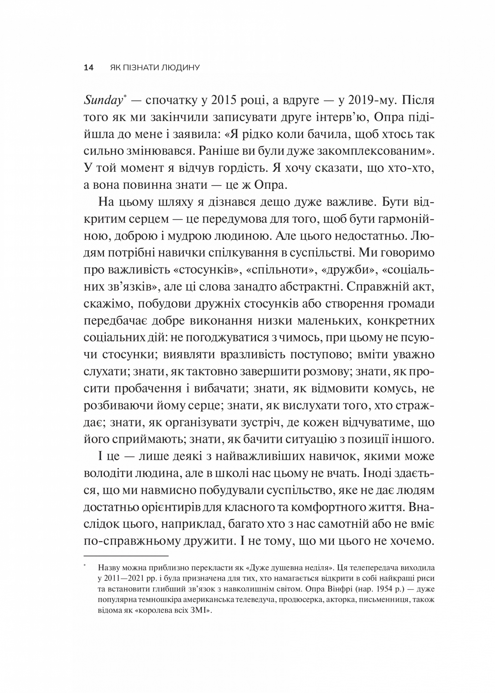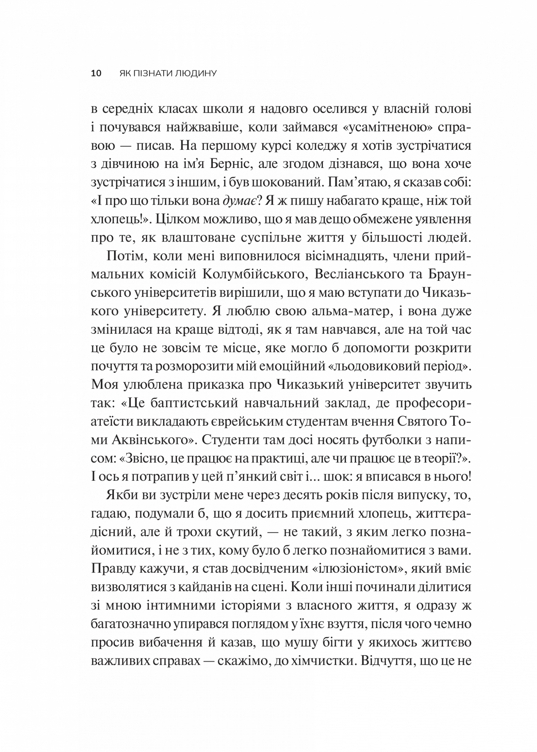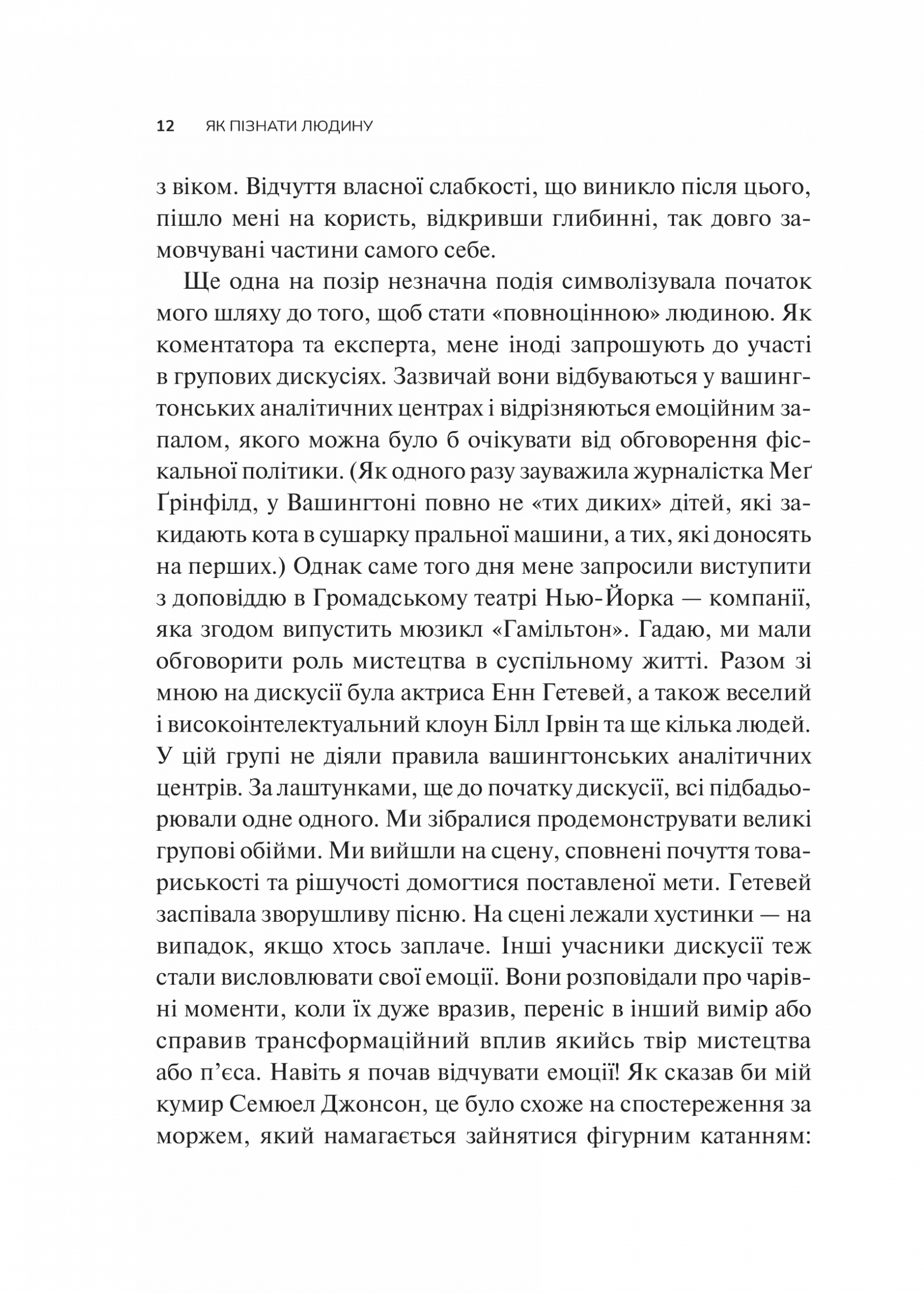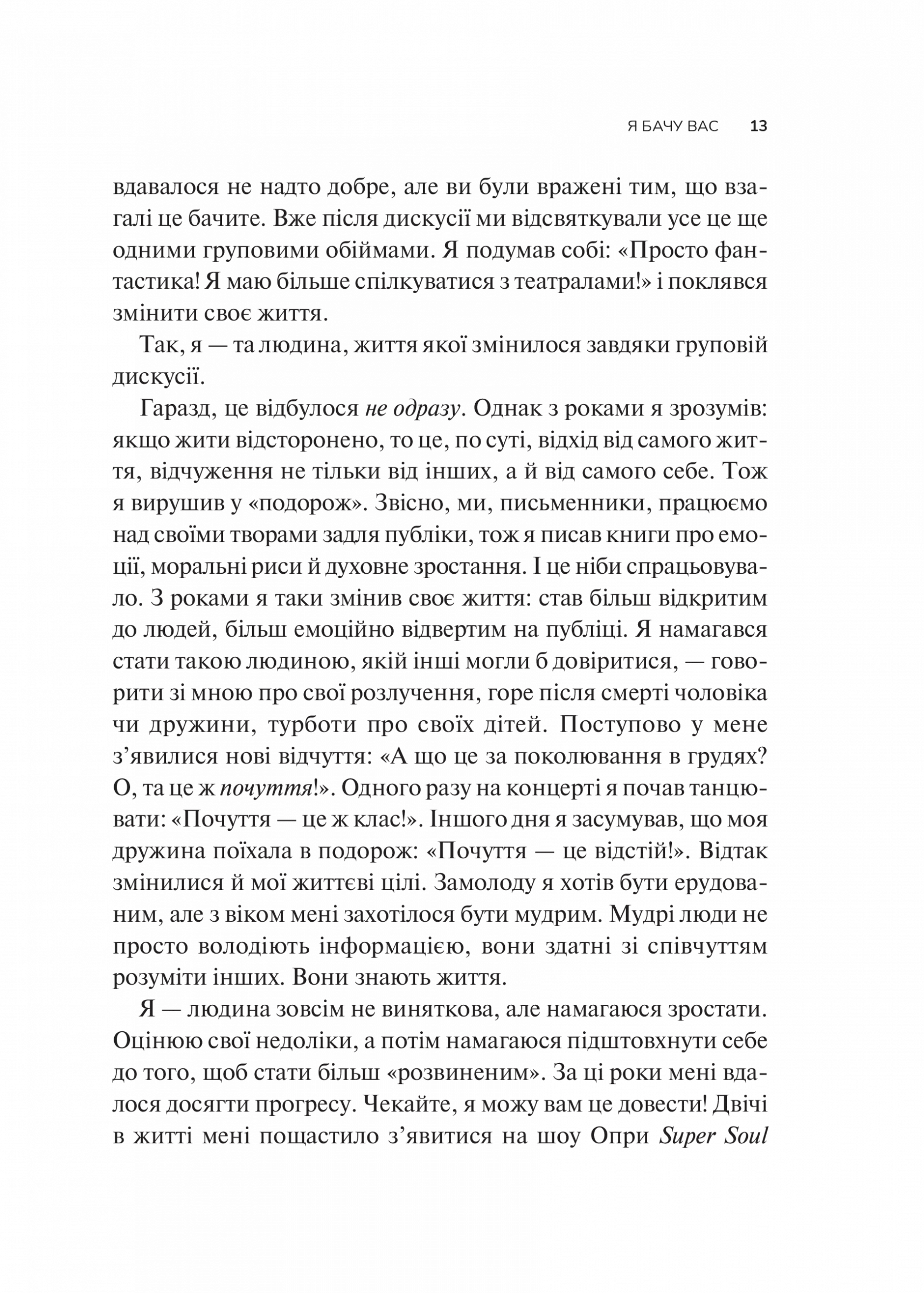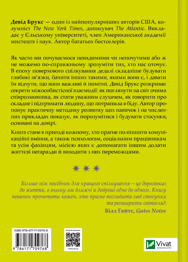 Як часто ми почуваємося невидимими чи непочутими або ж не можемо по-справжньому зрозуміти тих, хто нас оточує. В епоху поверхового спілкування дедалі складніше будувати глибокі зв'язки, бачити інших такими, якими вони є, і давати їм відчути, що вони важливі й помітні. Девід Брукс розкриває секрети міжособистісної взаємодії: як поглянути на світ очима співрозмовника, як стати уважним слухачем, як говорити про складне і підтримати людину, що потрапила в біду. Автор пропонує практичну методику розвитку цих навичок і на численних прикладах показує, як порозумітися і будувати стосунки, основані на довірі.