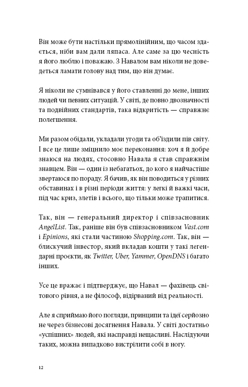 Завдяки глибоким ідеям Навала, які викладено з великою турботою Еріка Йорґенсона, ви знайдете відповіді на ключові запитання про фінансову свободу, внутрішній спокій і життєвий зміст.