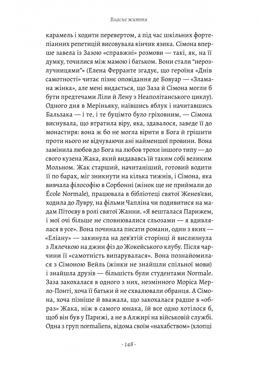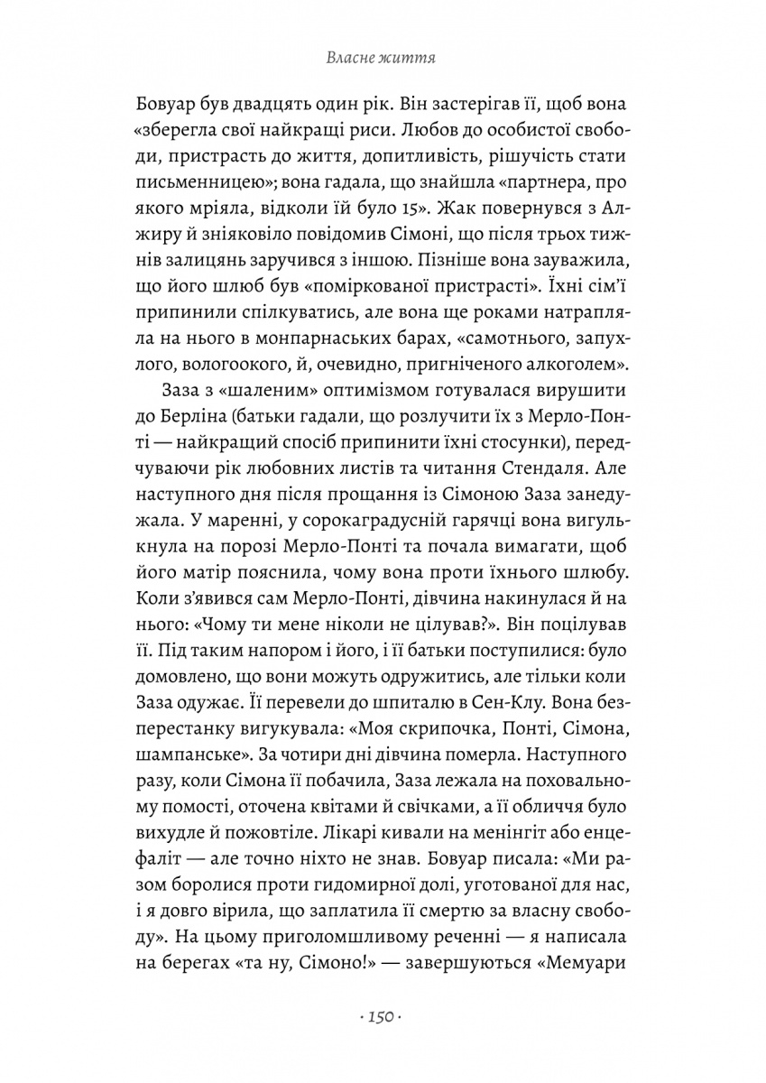 Книга Власне життя від авторки Джоанни Бігґз — це емоційно насичене поєднання мемуарів, літературознавчої критики та біографічних нарисів, яке влучно відображає боротьбу жінок за себе та своє право бути вільними. У центрі дослідження — внутрішній пошук самоідентичності жінки, яка відмовилася від стереотипного шлюбу та віднайшла натхнення у словах дев’яти культових письменниць.