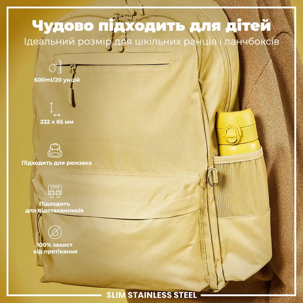 - Компактний об’єм — 600 мл (20 унцій) — оптимально для дітей і дорослих у місті, на навчанні чи прогулянці.