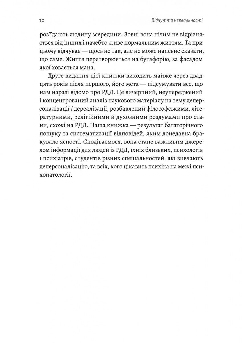 У своїй праці автори описують не тільки клінічні аспекти РДД, а й відкривають філософські, духовні та літературні перспективи сприйняття особистості. Вони розповідають про те, як це – жити в стані внутрішньої порожнечі, коли емоції здаються фальшивими, а реальність – далекою.
