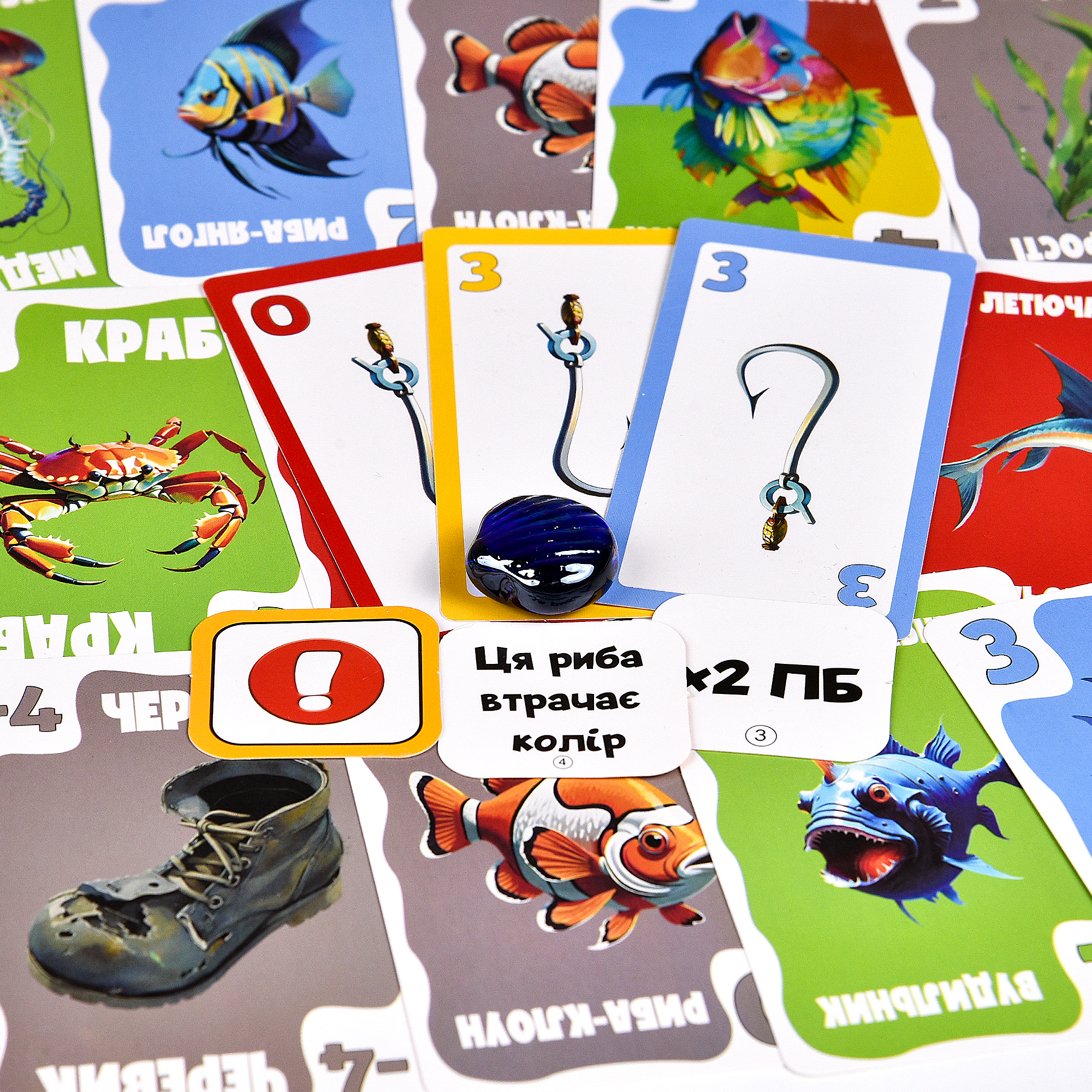Головна мета – зібрати якнайбільше виграшних карт. Кожен хід — це ставка на конкретну рибу. Ви дієте в умовах обмеженої інформації, адже не знаєте, що обрали інші гравці. Саме тому гра вчить стратегічному мисленню, передбаченню дій суперників та прийняттю ризикованих рішень. Перемагає той, хто краще відчуває суперників і фарту!