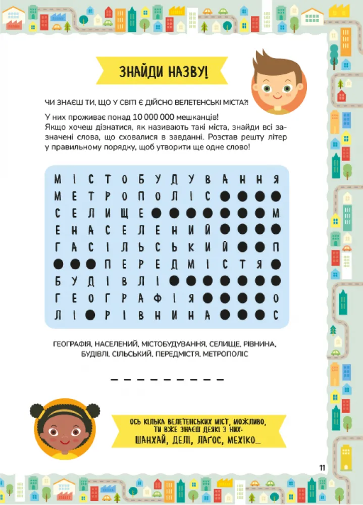 Цей посібник дозволяє дослідити світ міст з інших точок зору. Завдяки захопливим фактам, цікавим іграм та пізнавальним завданням діти дізнаються: