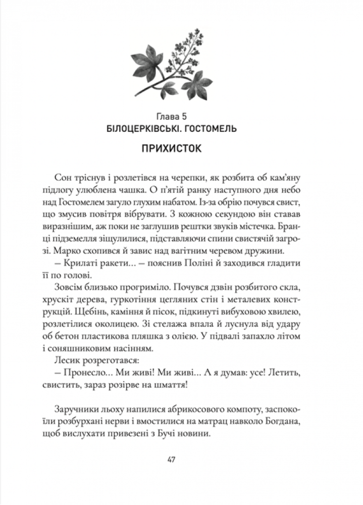 Роман проймає до кісток: сцени евакуації, рефлексії про втрати та непрості взаємини з ворогом, який водночас зобов’язаний головним героям більше, ніж просто допомогою. Ключовим символом у книзі стає каштан, пов'язаний з долею кожного героя — відчай і надія проростають разом з його квітами.