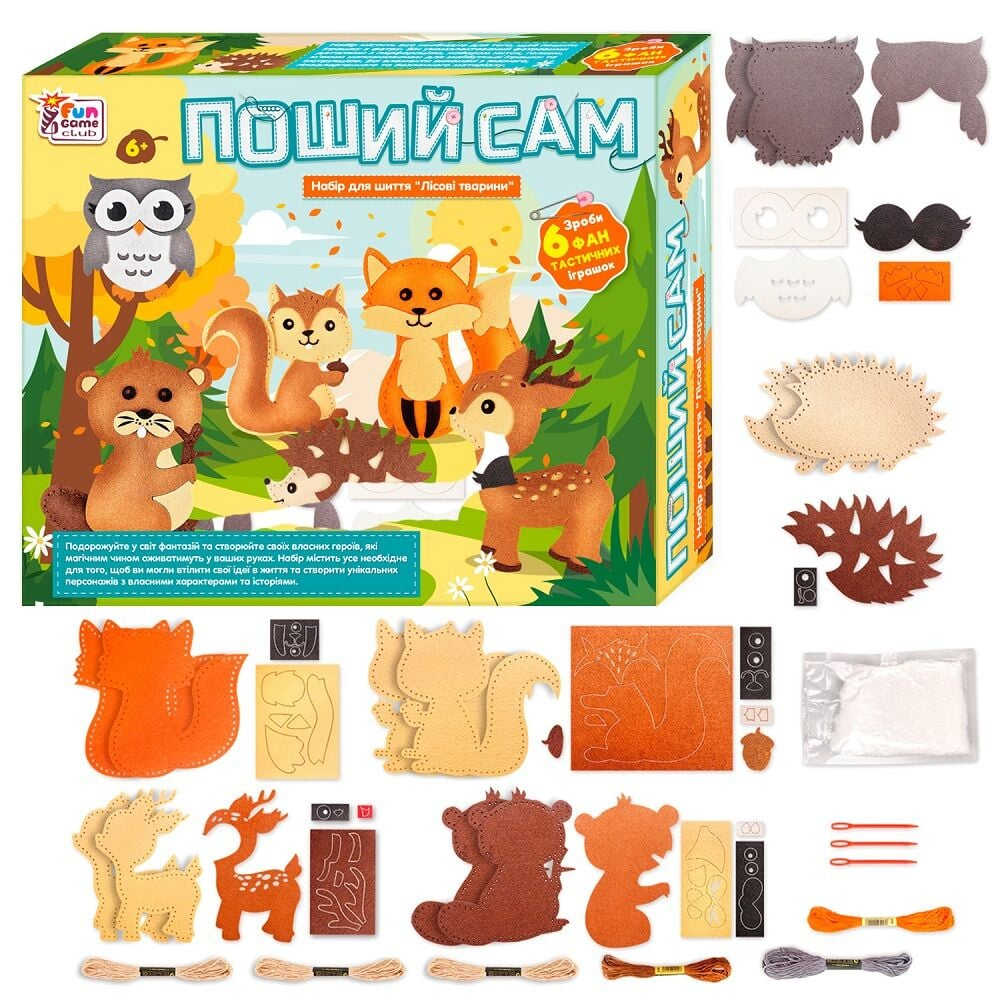 Подорожуйте у світ фантазій та створюйте своїх власних героїв, які магічним чином оживатимуть у ваших руках, разом з набором для шиття “Поший сам”. Набір містить усе необхідне для того, щоб ви могли втілити свої ідеї в життя та створити унікальних персонажів з власними характерами та історіями.Набір містить в собі:- готові шаблони з фетру для шиття;- нитки для вишивання;- пластикові оченята;- пластикові швейні голки;- бавовняний наповнювач.