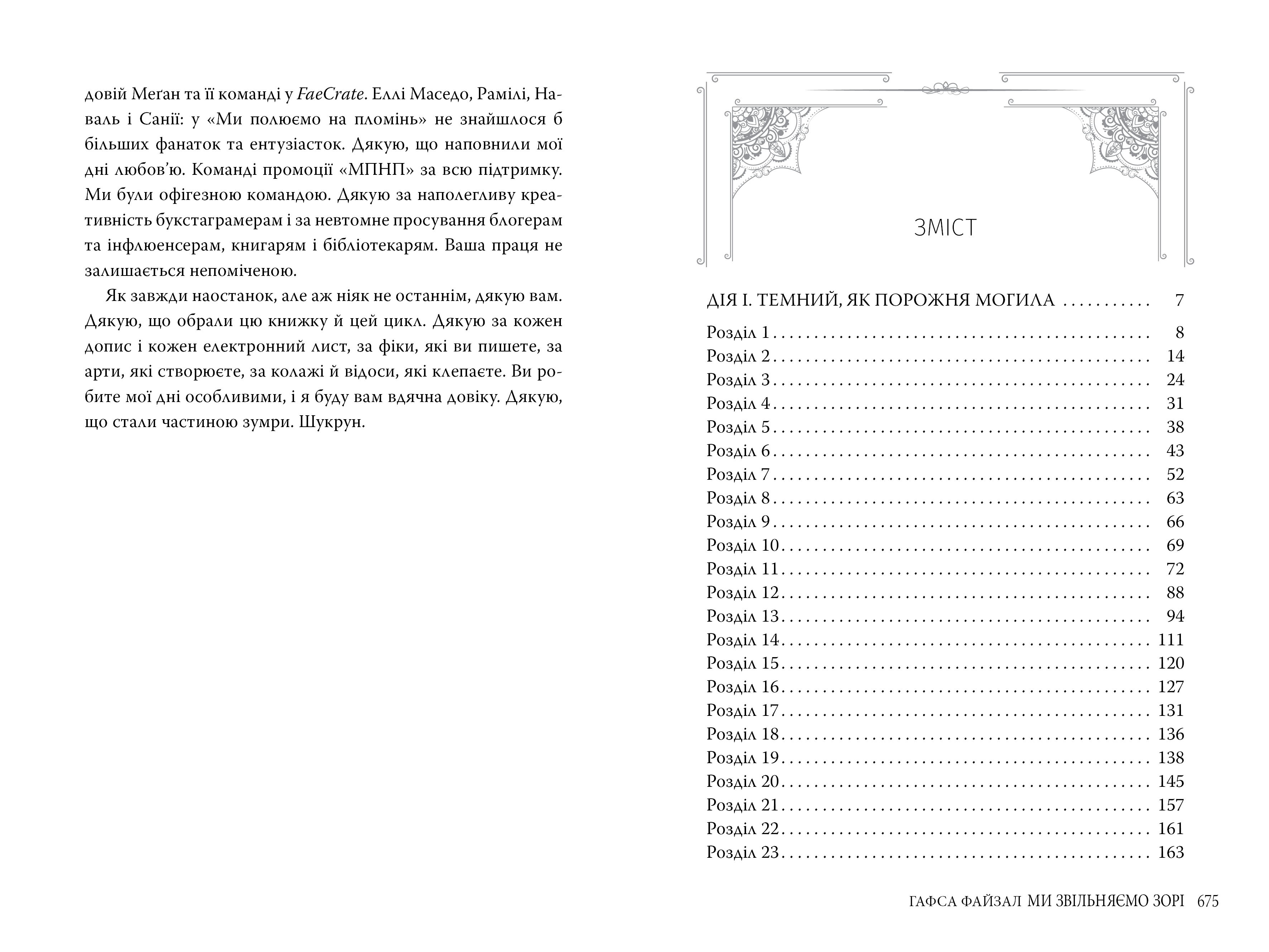 Фентезі-роман Ми звільняємо зорі — друга книга циклу Піски Арабії авторки Гафса Файзал. Цей твір є захопливою подорожжю у світ магії, бойових протистоянь і глибоких особистих трансформацій героїв. Після напруженої битви на Шаррі, компанія героїв — Зафіра, Насір і Кіфа — вирушає до Твердині Султана з метою здійснити останній план Альтаїра: відновити магію в межах усієї Арабії.