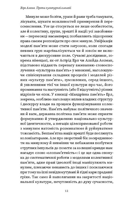 У книзі Віра Агеєва розглядає український досвід крізь призму постійного спротиву політиці забування. Через цікаві історичні епізоди, аналіз художніх текстів та соціокультурних подій, вона показує, як колонізатори нав’язували чужу інтерпретацію історії. Книга спонукає до осмислення того, що нація існує доти, доки здатна пам’ятати та переосмислювати своє минуле.