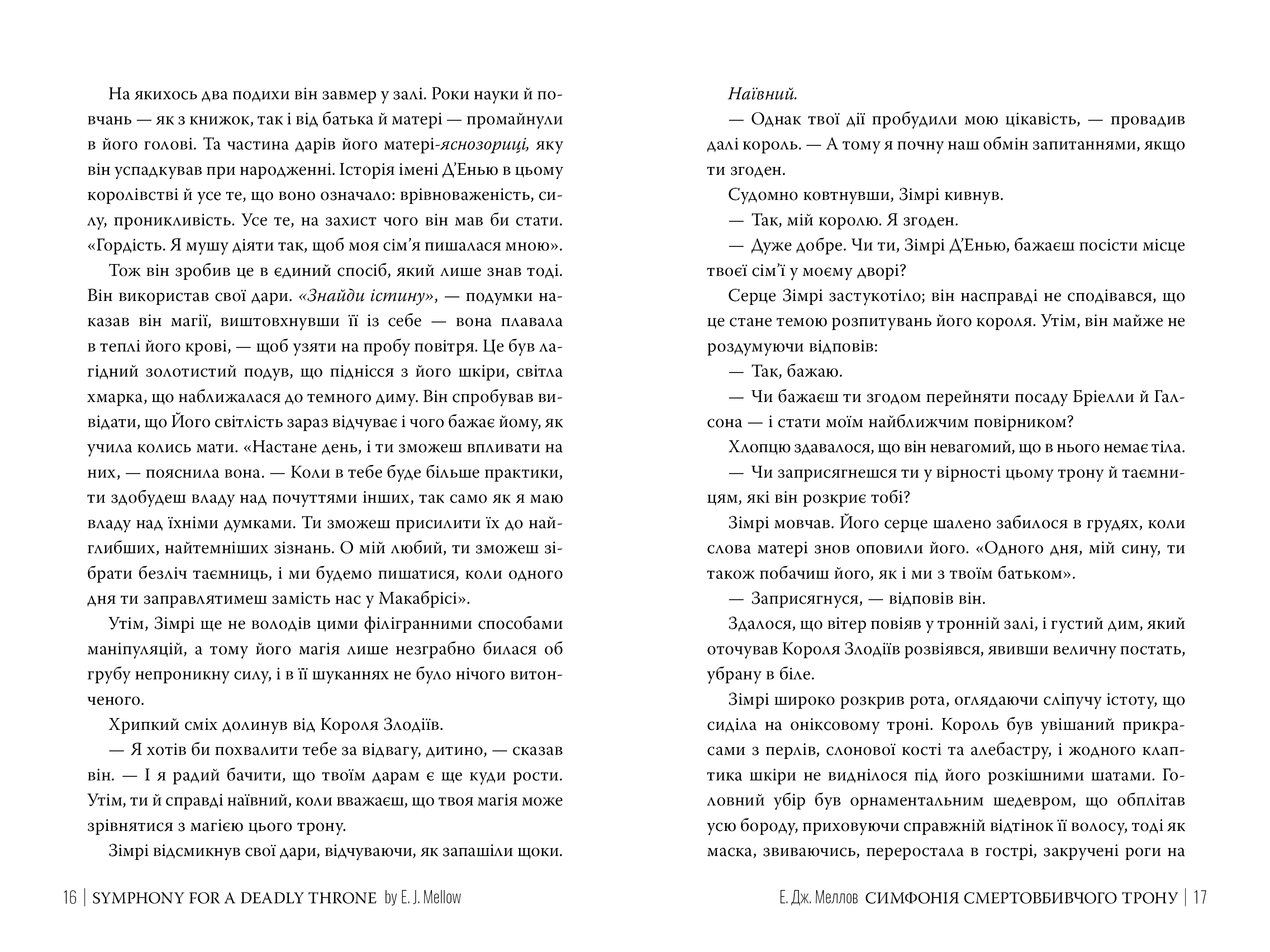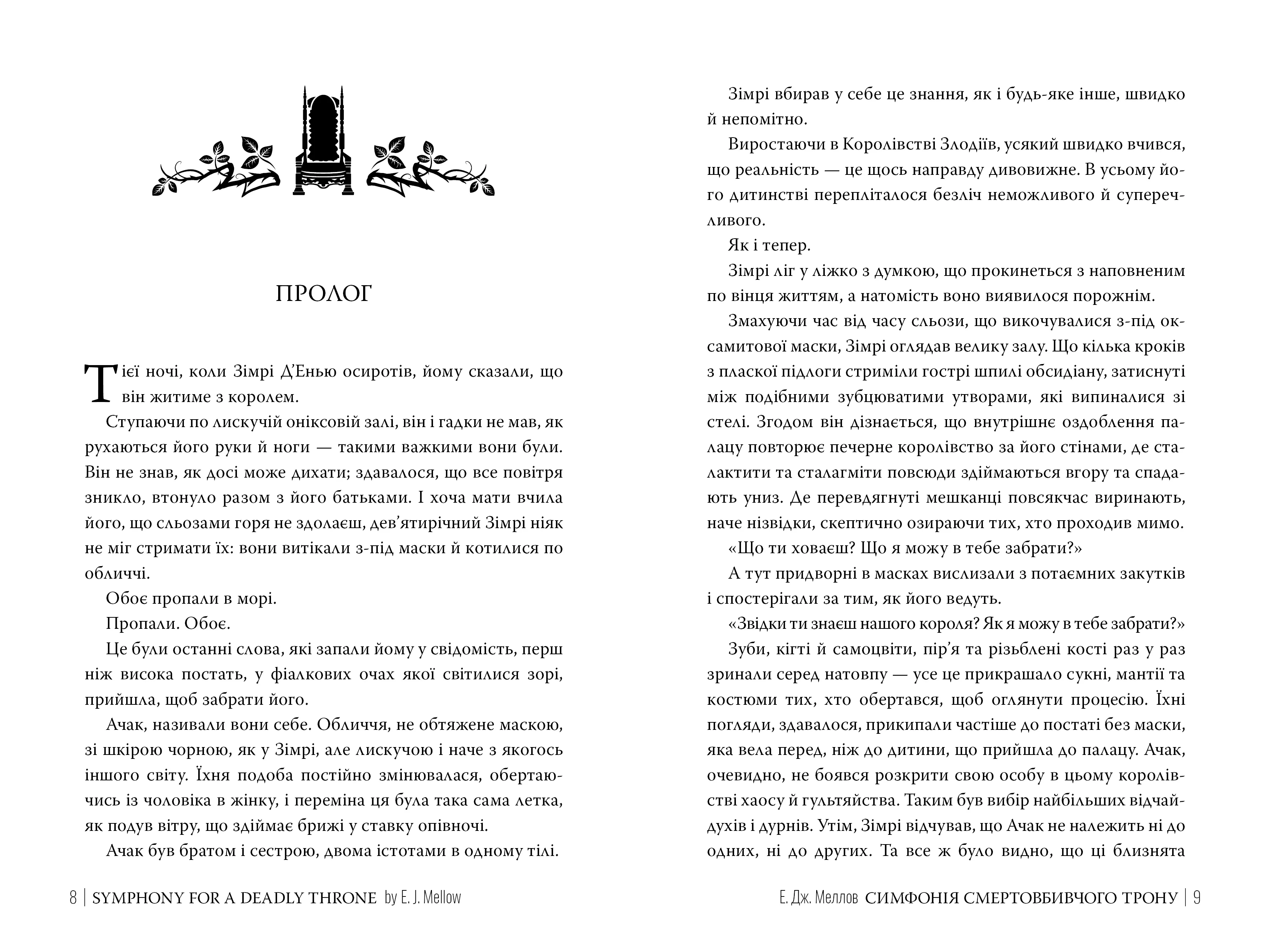 Симфонія смертовбивчого трону — завершальна частина захопливої фентезійної трилогії Мусаї, автором якої є Е.Дж. Меллов. У цій історії читач поринає у світ Аадилору, де панують магія, темрява та смертельні інтриги. Саме тут, у Королівстві Злодіїв, таємниче тріо сестричок-чарівниць Мусаї виконує накази свого Короля.