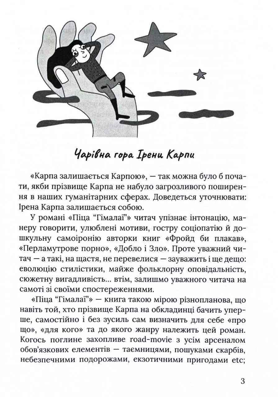 Книга Піца Гімалаї — це захоплива пригода з неочікуваною зав'язкою, сповнена гумору, екшну та філософських підтекстів. Головна героїня на ім'я Редька отримує загадкового листа. За кілька хвилин у двері дзвонить, а за порогом — невідомий пакунок із дорогим GPS-навігатором. Саме з цього моменту починається її шлях до самопізнання та втечі від повсякденної буденності.
