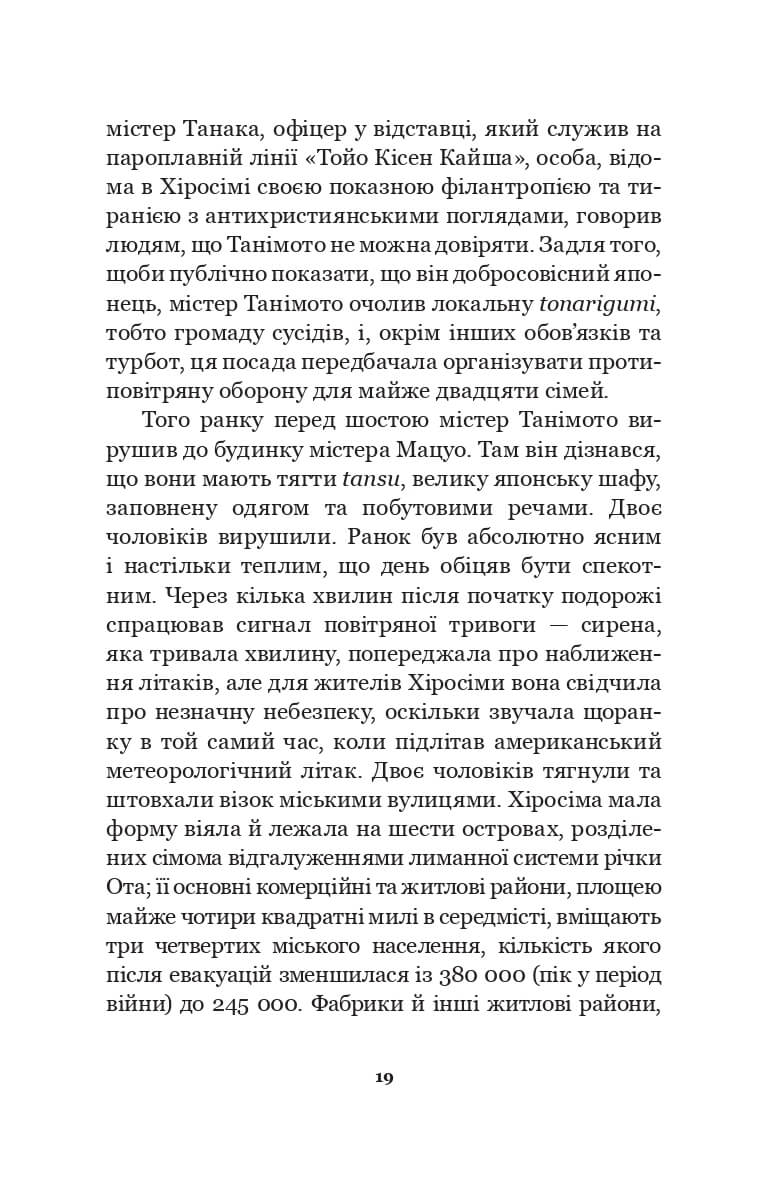6 серпня 1945 року вперше в історії людства застосовано ядерну зброю: американський бомбардувальник скинув атомну бомбу на японське місто Хіросіму. Понад 100 тисяч людей загинули, сотні тисяч отримали поранення та променеву хворобу. Рік по тому журнал The New Yorker присвятив окремий номер репортажу Джона Герсі, який зафіксував, що сталося з шістьома японцями, які вижили під час і після вибуху.