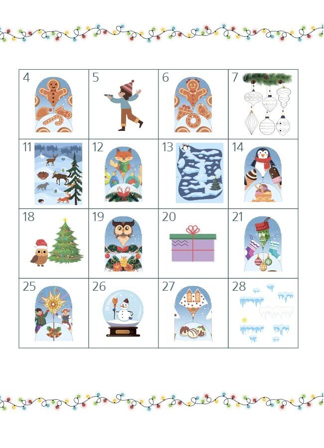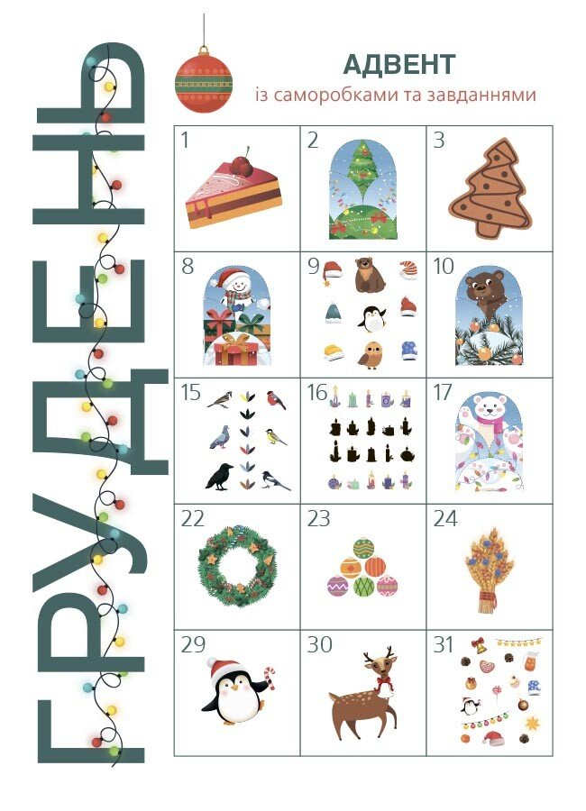 У зошиті представлений один із найактуальніших форматів — адвент-календар, адаптований для дітей віком 3–4 роки. Кожна сторінка — це активність, яка розвиває моторику, уяву, увагу та сприяє спілкуванню в родині.