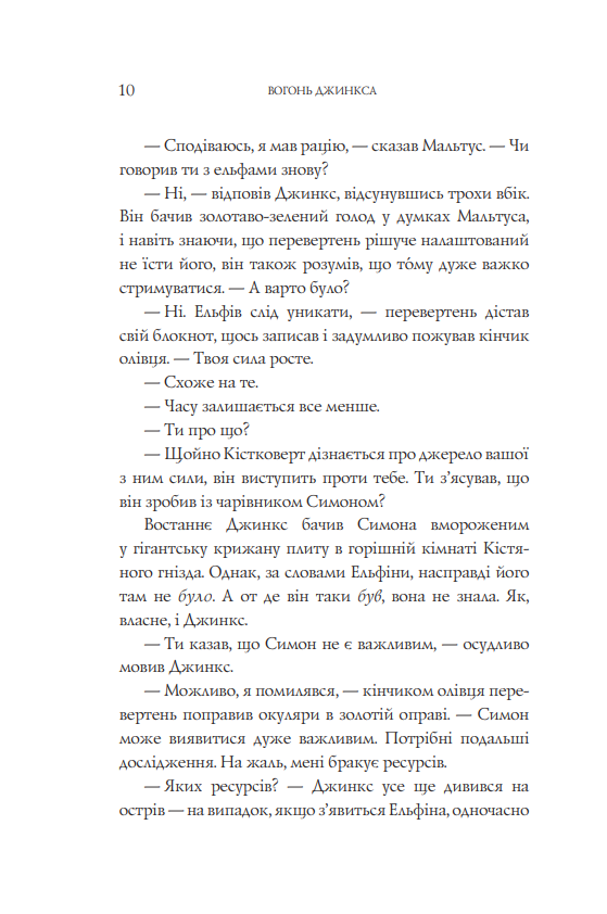 У завершальній частині чарівної трилогії Сейдж Блеквуд «Вогонь Джинкса» юний маг Джинкс має зробити остаточний вибір між світлом і темрявою, між силою і мудрістю. Дрімливий ліс Урвальд знову в небезпеці, і Джинкс, який навчився чути голоси дерев, повинен об’єднати друзів і протистояти давньому злу. Чи зможе він подолати спокусу темної магії і врятувати все, що йому дороге? Відповіді ховаються у вогні, що палає в його душі.