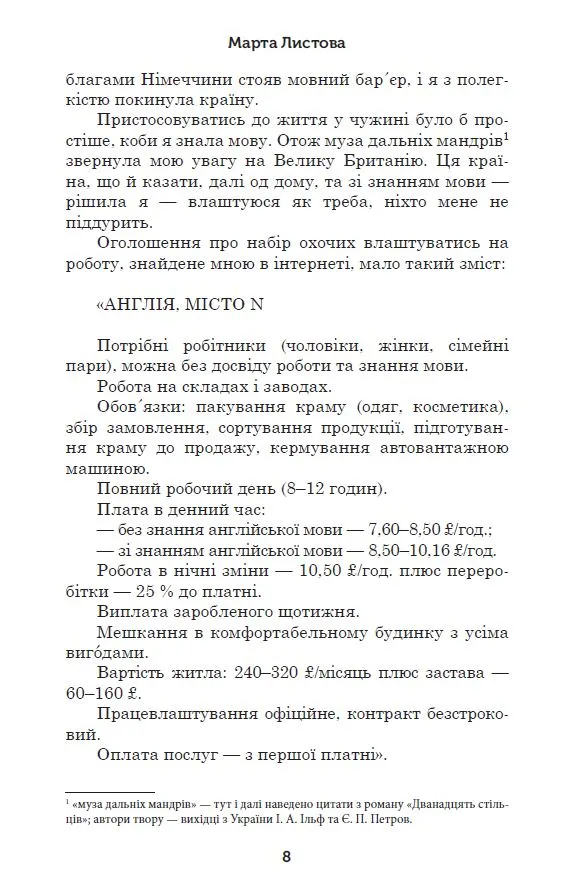 Книга Одкид авторства Марти Листової — це глибока психологічна проза, що розкриває внутрішній світ героїні, яка опинилася в складних життєвих умовах за кордоном. Пошук нового життя, невдоволення роботою і особистими стосунками, проблемні сусіди — усе це перетворюється на метафоричну подорож до себе.