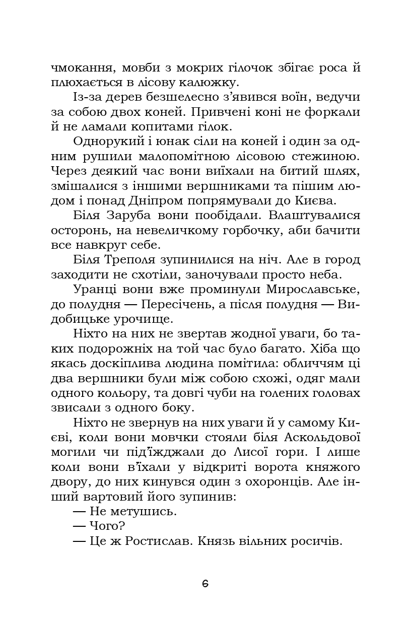 Окремі сторінки цієї повісті присвячені професійним воїнам з річки Рось та тому, як вони навчали бойовим мистецтвам молодого князя Святослава. Військові походи Святослава, його битви в Болгарії розкриють перед нами його сміливість та природжений талант полководця.