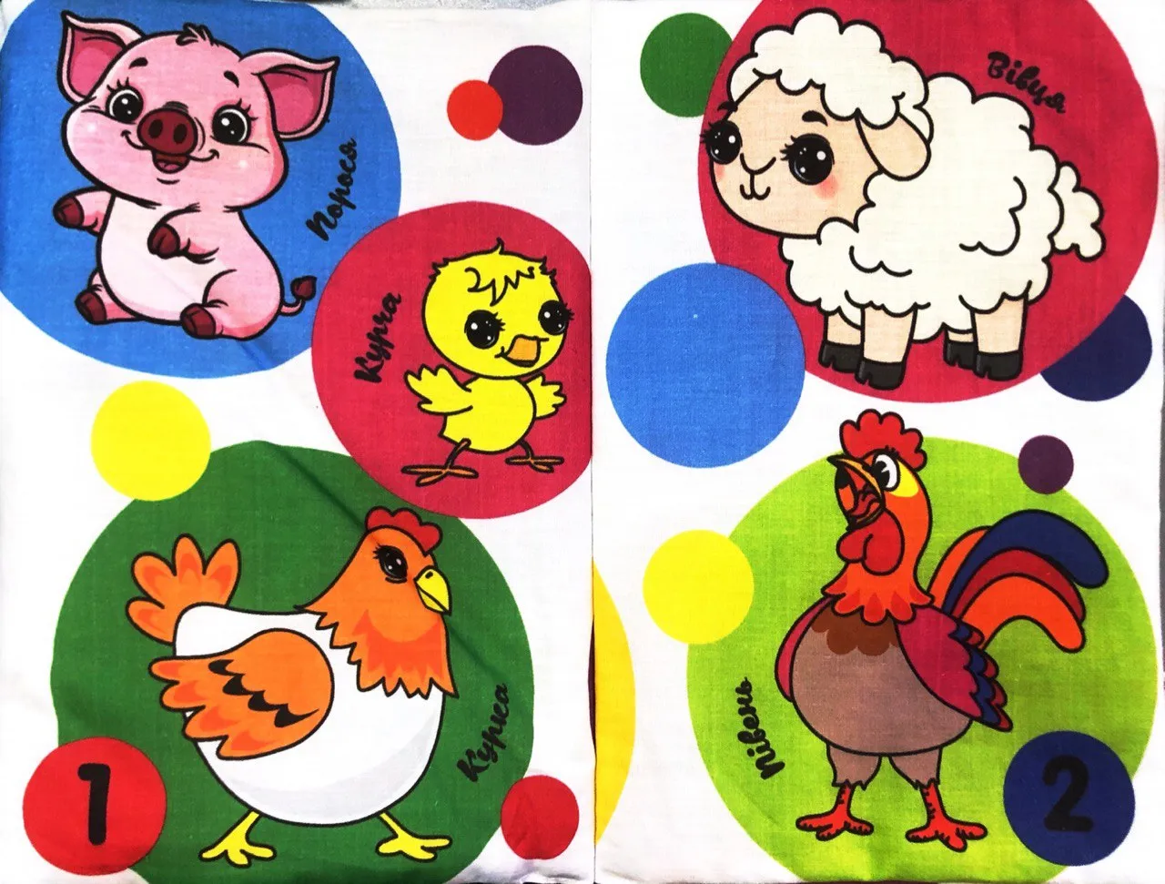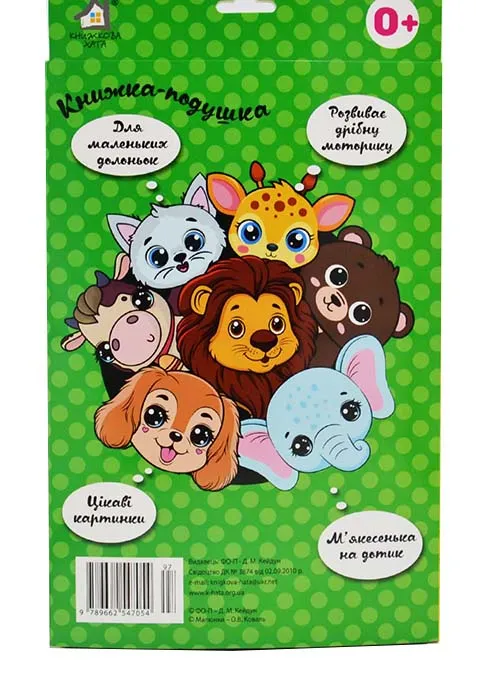 М'яка книжечка тварини від видавництва Книжкова хата — це чудова розвиваюча книга для наймолодших читачів. Надрукована на безпечному текстилі, вона містить 8 сторінок з яскравими кольоровими ілюстраціями, які знайомлять дитину з тваринами.
