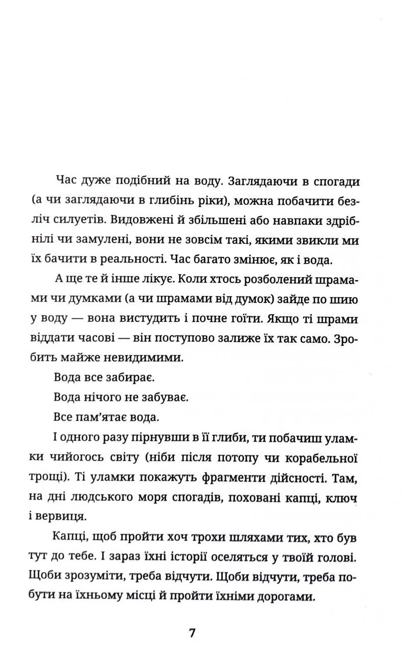 У центрі сюжету — розслідування персонажа Богдана Вовка. Через незвичне видіння підводного світу він відкриває для себе та читача драматичні сторінки минулого. Важливою темою роману стає втрата — ці села, які були затоплені під час будівництва водосховищ для гідроелектростанцій, стають символом забутої історії та втраченої ідентичності.