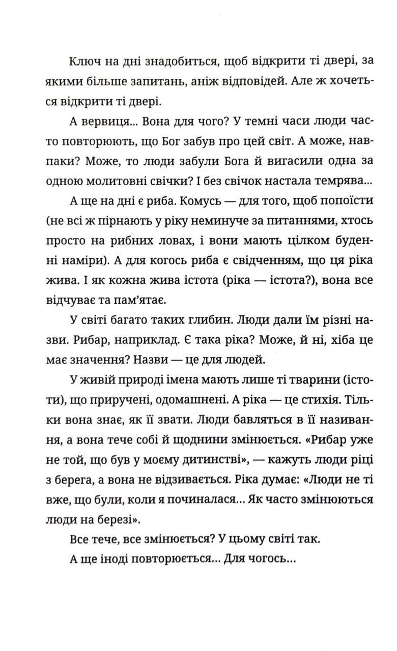 Незважаючи на метафоричність географічних назв, реальні події й натхнення авторка черпала зі свідчень жителів з Чернівецької, Хмельницької і Київської областей. Центральним символом є образ річки Рибар. В ній читачі з різних куточків України впізнають свою річку, своє водосховище та свою Атлантиду — світ, що пішов під воду разом з пам’яттю, віруваннями, легендами та життями.