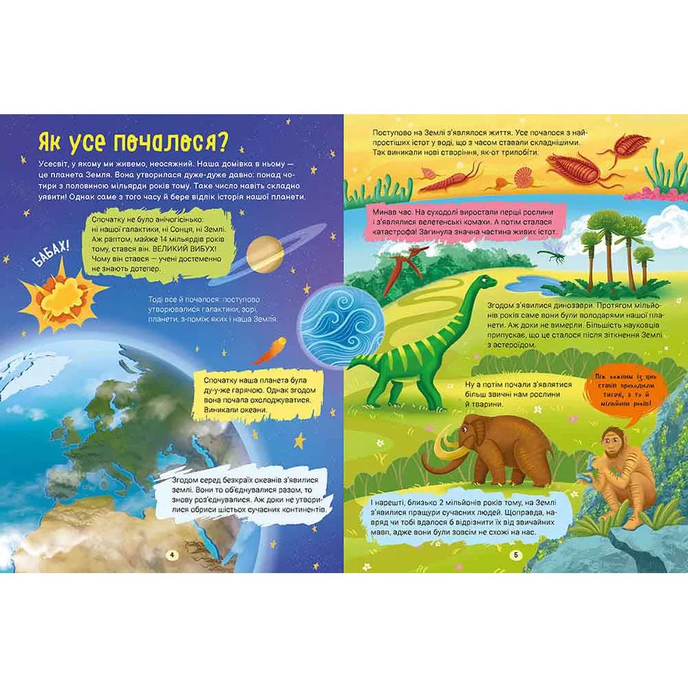 Із самого початку книга пояснює дітям, як утворилась наша планета й хто був першим мешканцем українських земель. Далі юні читачі дізнаються про виникнення перших поселень, виникнення Київської Русі, козацькі часи та етапи формування незалежної України.